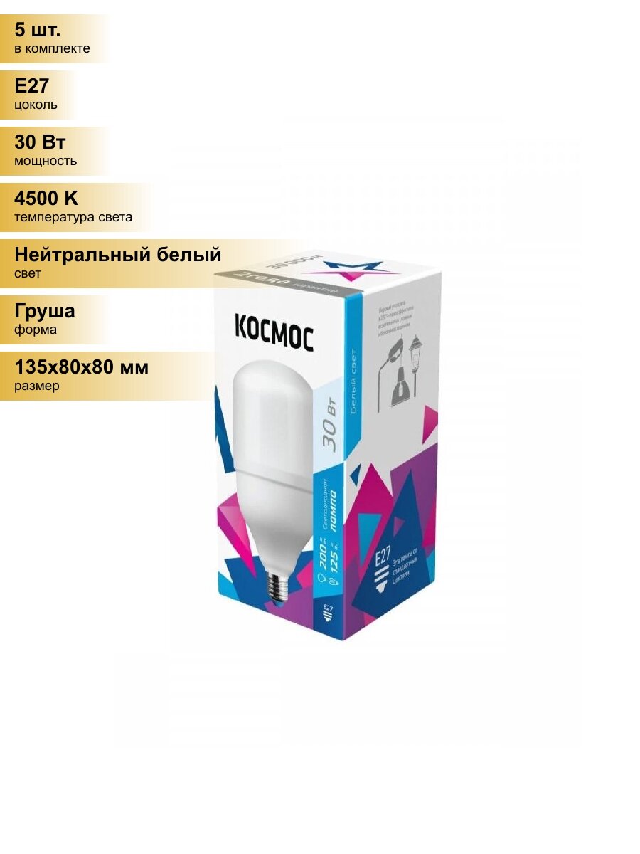Комплект 5 штук, Лампа светодиодная Космос 30W E27 6500k хол.бел. HW