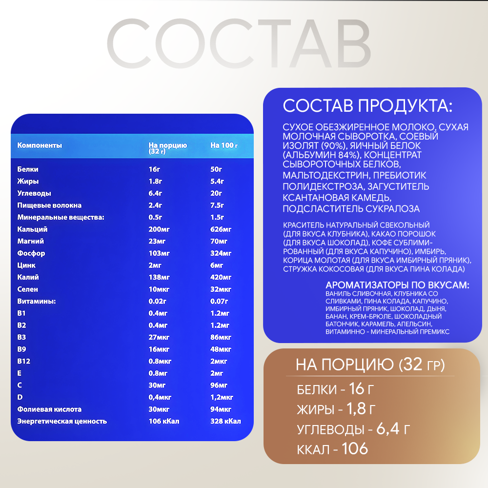 | Дополнительная информация | рекомендации по применению: Cмешайте 2 мерные ложки продукта (32 гр) с 250-350мл обезжиренного молока, воды или любой другой жидкости в шейкере или блендере, через 2-3 минуты повторно взболтайте. Принимать между основными приемами пищи, до и после тренировки.При подборе дозировок необходимо учитывать уровень физической подготовки, а также возраст, пол и массу тела. Перед употреблением рекомендуем проконсультироваться со специалистом.; состав: Сухое обезжиренное молоко,сухая молочная сыворотка,соевый изолят,яичный альбумин, концентрат сывороточных белков,мальтодекстрин,пребиотик полидекстроза,подсластитель сукралоза,ароматизатор,витаминно-минеральный комплекс. |
