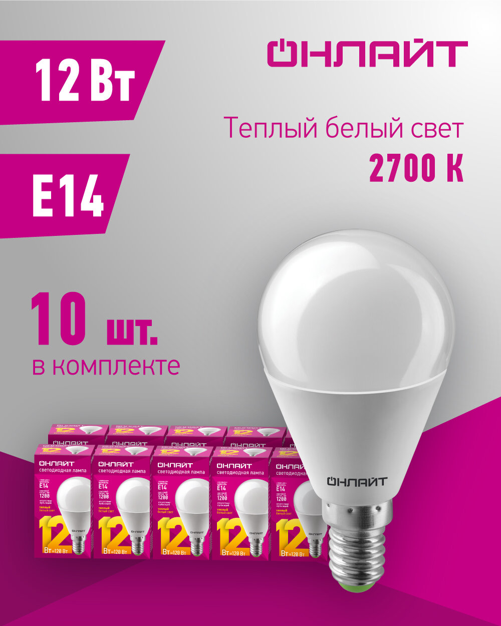 Купить Лампа светодиодная онлайт 90 060, 12 Вт, шар Е14, теплый свет 2700К, упаковка 10 шт.
