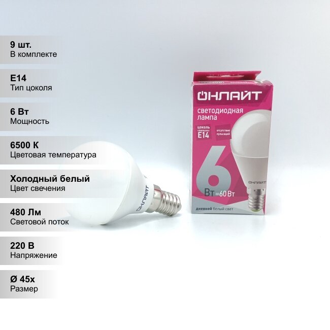 Сохранить(9 шт.) Светодиодная лампочка онлайт G45 6Вт 220В, цоколь E14, цветовая температура 6500K, холодный белый свет, световой поток 480 Лм, размер 45x79 интересное: