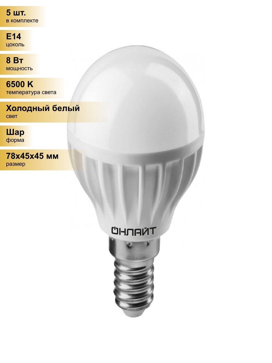Купить (5 шт.) Светодиодная лампочка онлайт шар G45 E14 8W(640Lm) 6500K 6K 78x45 OLL-G45-8-230-6.5K-E14 61135 Холодный белый. Цоколь E14