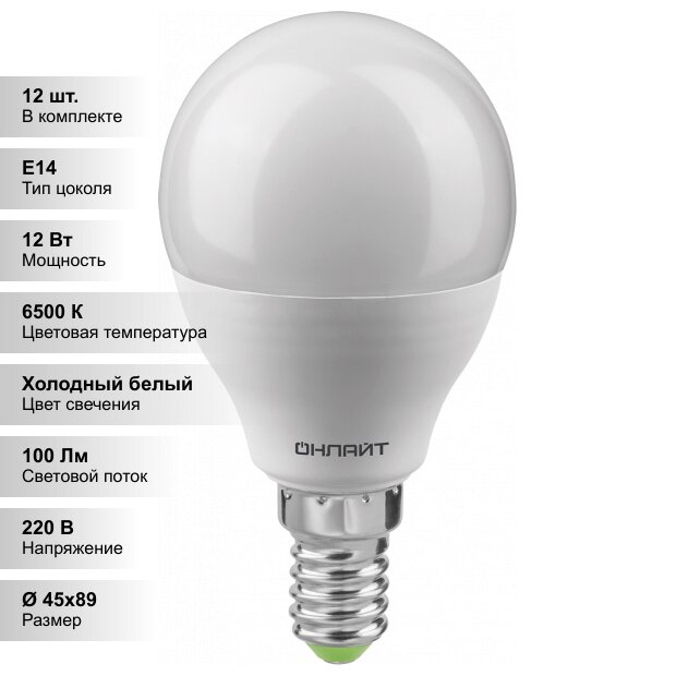 Лампа светодиодная онлайт 90 062, 12 Вт, шар Е14, холодный свет 6500К, упаковка 10 шт.