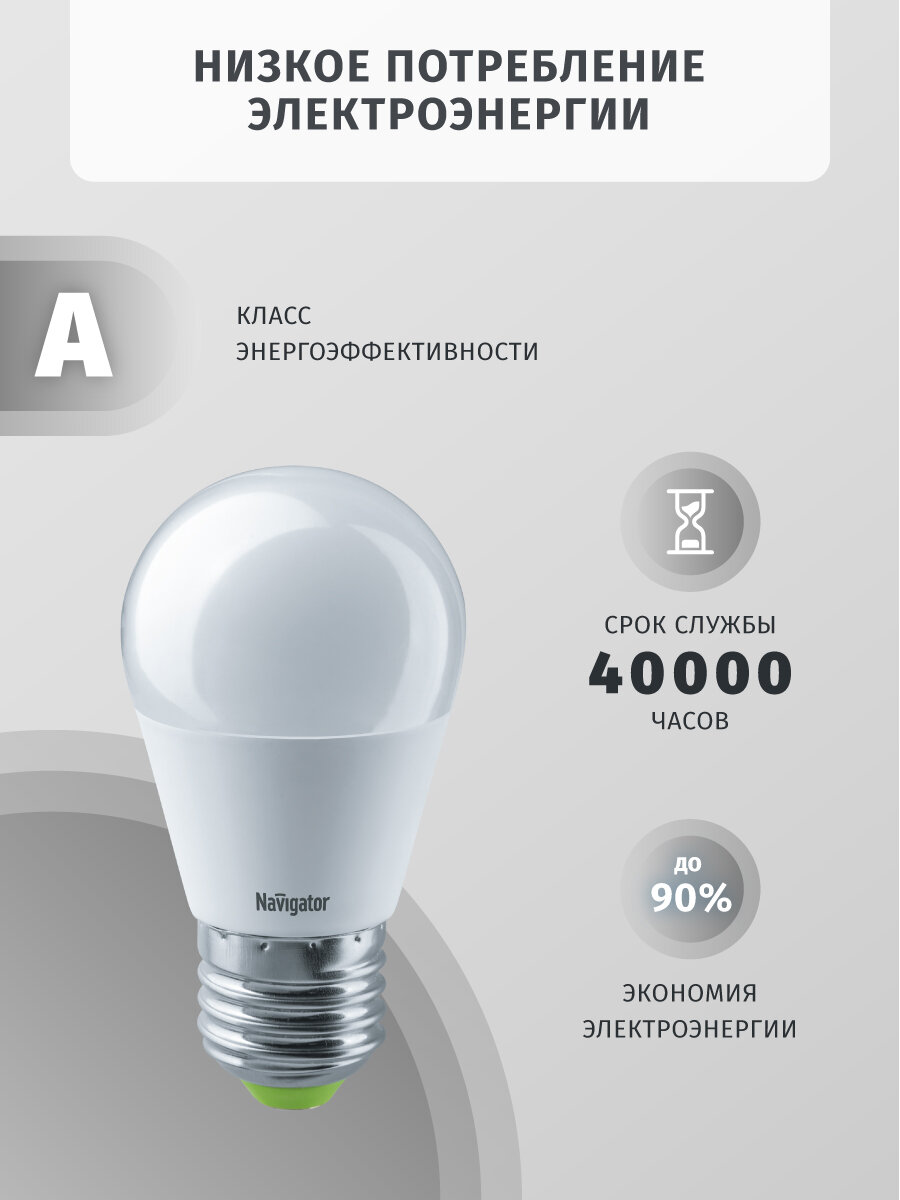 Лампа светодиодная Navigator 61 253, 5 Вт, шар, Е27, холодный свет 6500К, упаковка 10 шт.
