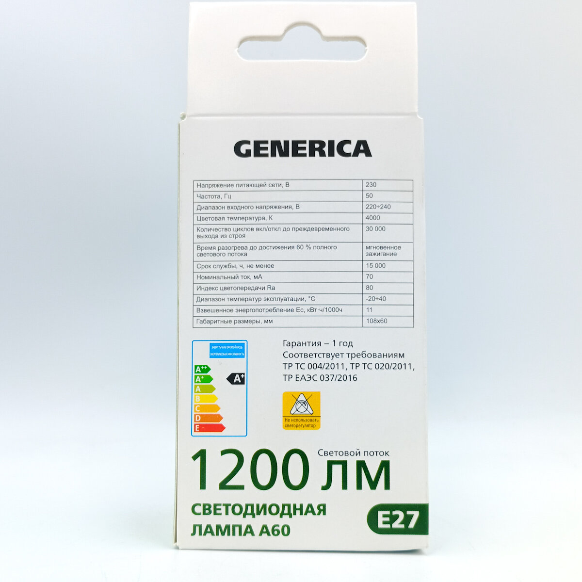 (12 шт.) Светодиодная лампочка GENERICA A60 груша, мощность 11 Вт, напряжение питания 220 В, цоколь Е27, цветовая температура 4000 К, нейтральный белый свет, световой поток 1200 Лм, размер 60х108 мм