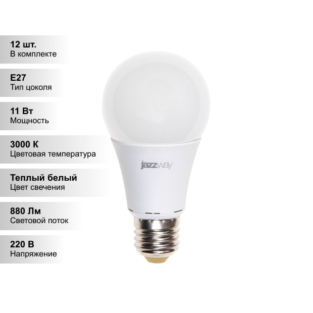 Купить (12 шт.) Светодиодная лампочка Jazzway A60 11Вт 220В 3000K E27