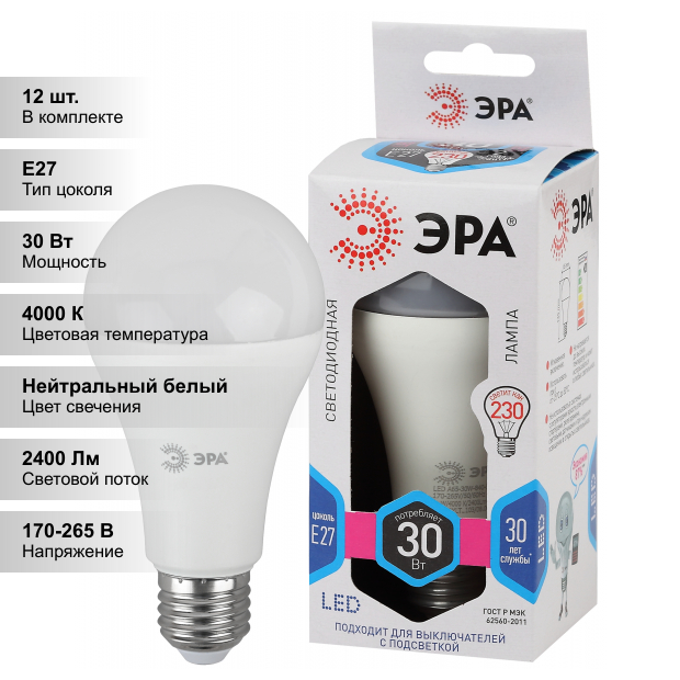 Купить (12 шт.) Лампочка светодиодная ЭРА LED A65 груша, мощность 30 Вт, напряжение питания 220 В, цветовая температура 4000 К, нейтральный белый свет, цоколь E27, размер 65х132 мм