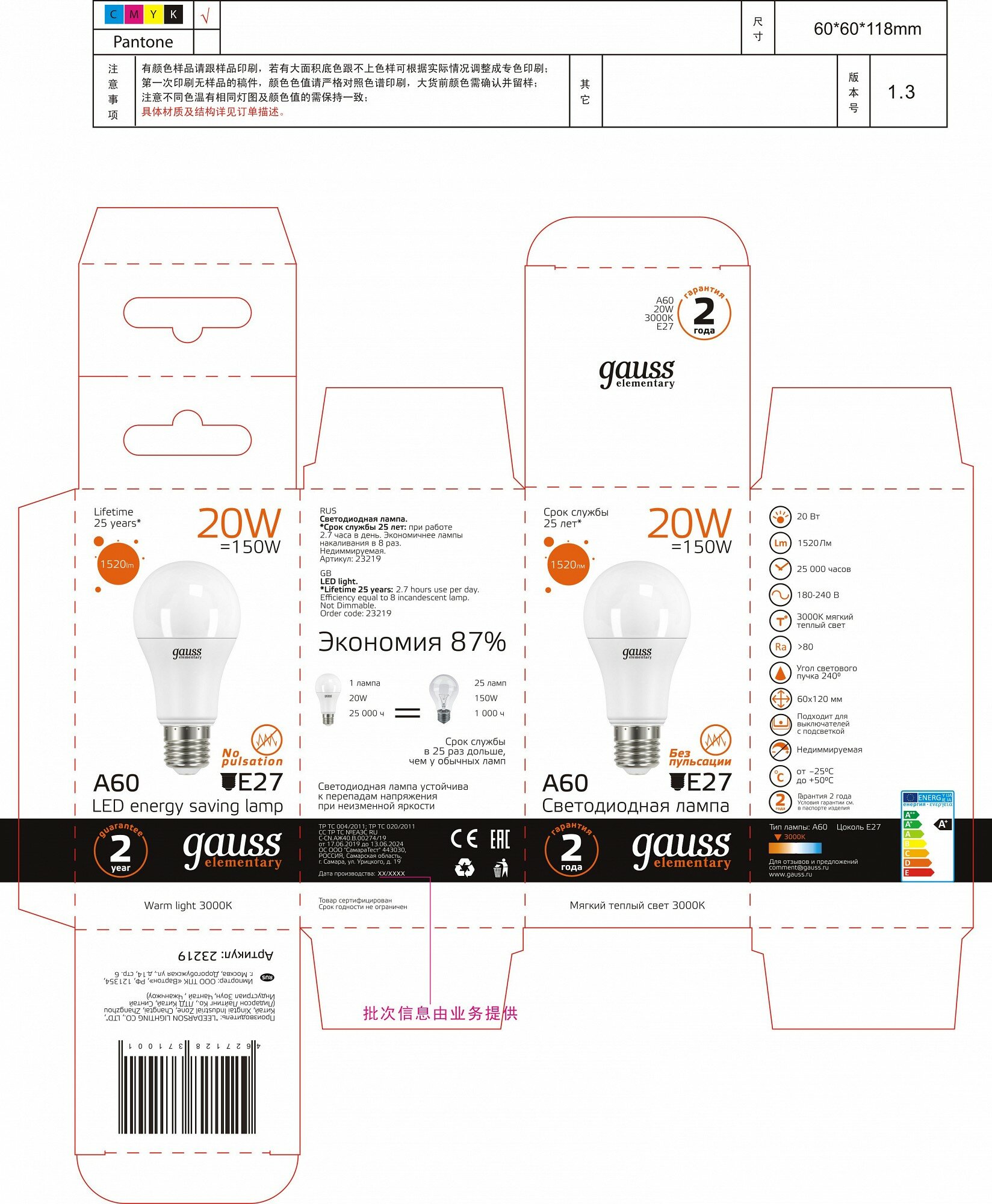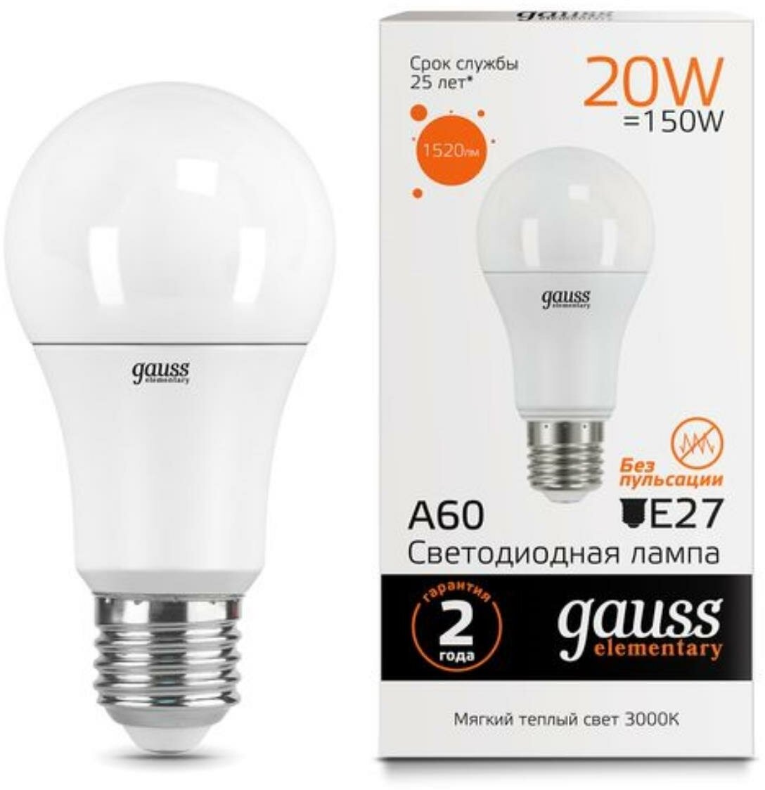 (5 шт)Лампа Gauss Elementary A60 20W 1520lm 3000K E27 LED 1/10/40