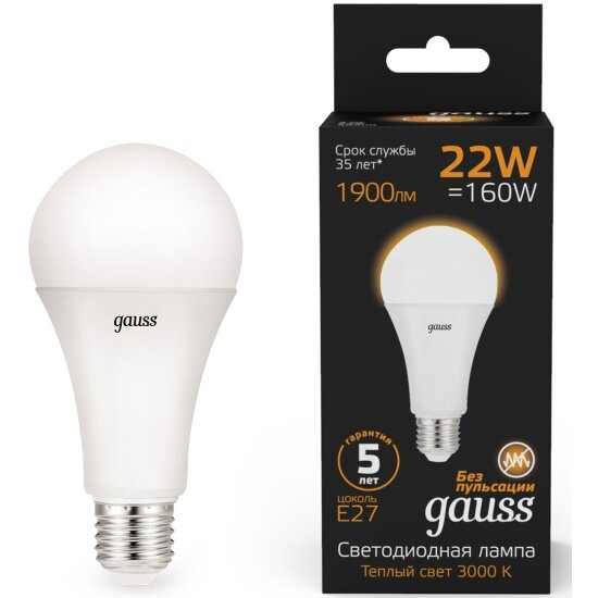 Комплект 5 штук, Лампа светодиодная Gauss 22W E27 A70 3000K 1560lm 102502122