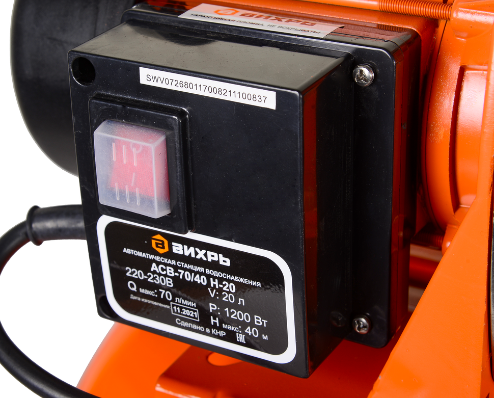 Купить Автономная станция водоснабжения Вихрь АСВ-70/40 Н-20, 1200 Вт, напор – 40 м, 70 л/мин, гидроаккумулятор – 20 л