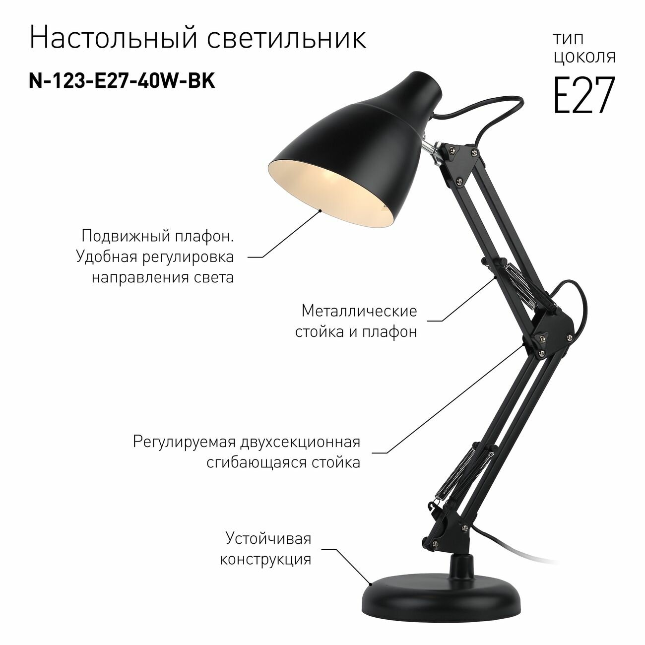 Светильник настольный ЭРА N-123-Е27-40W-BK черный (12/96)