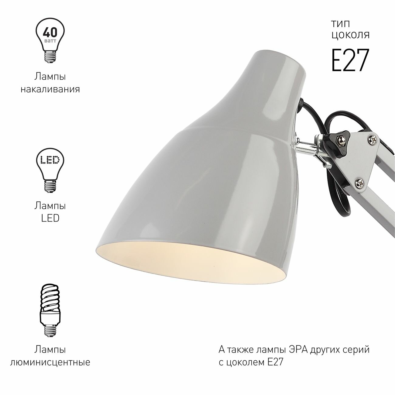 Лампа офисная ЭРА N-123-Е27-40W-GY, E27, 40 Вт, цвет арматуры: серый, цвет плафона/абажура: серый