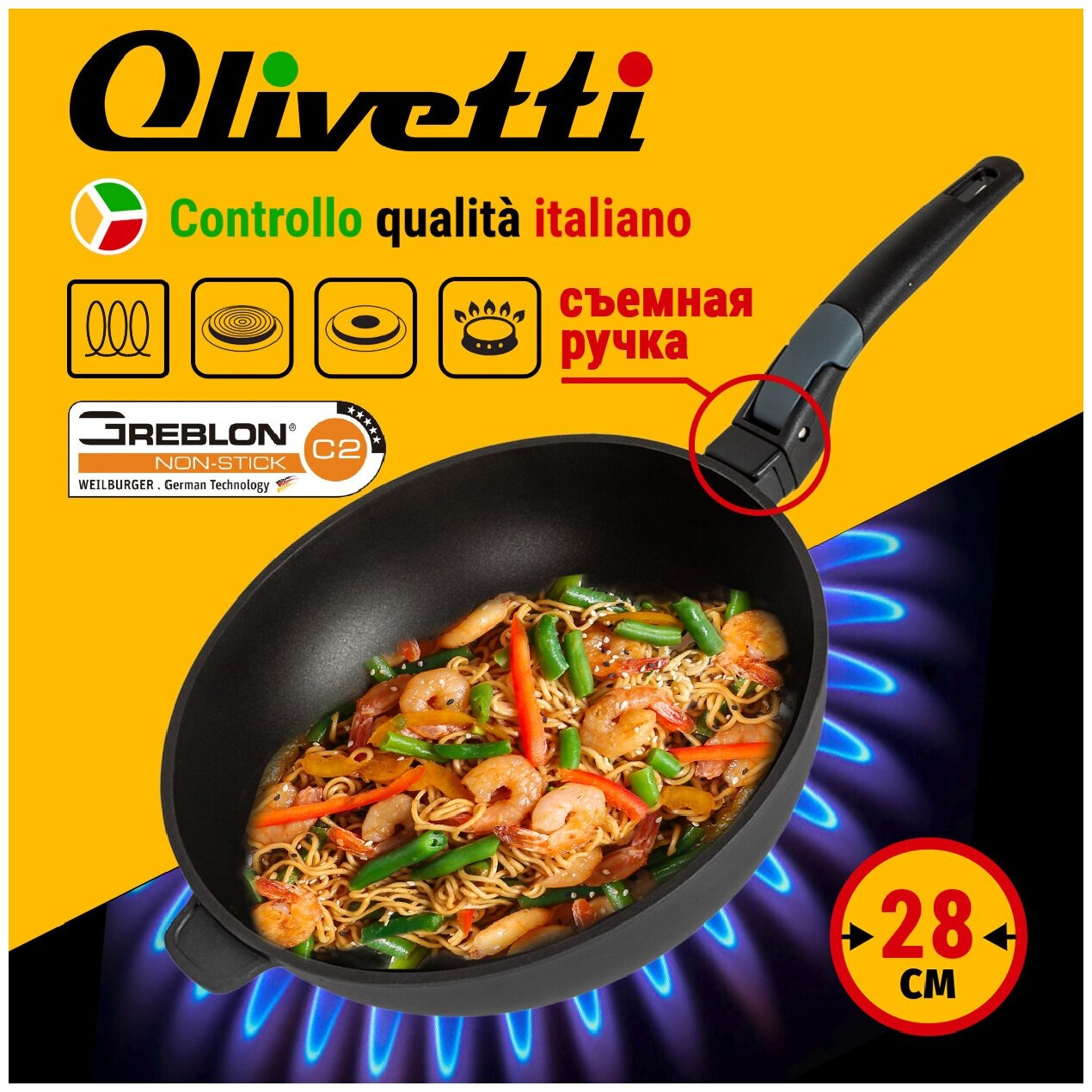 Сковорода Вок со съемной ручкой Olivetti и антипригарным покрытием Greblon С2 для всех типов плит и индукции, 28 см