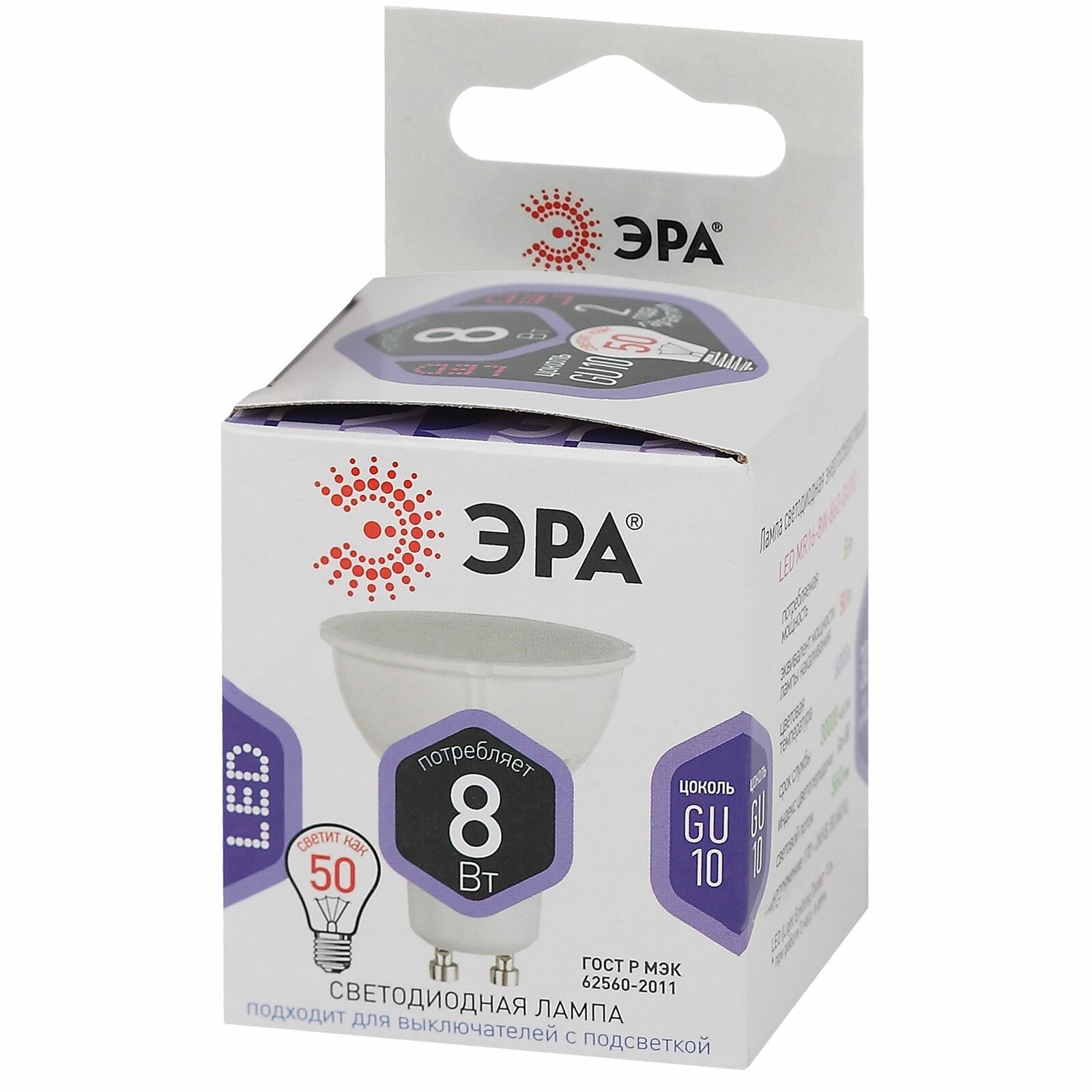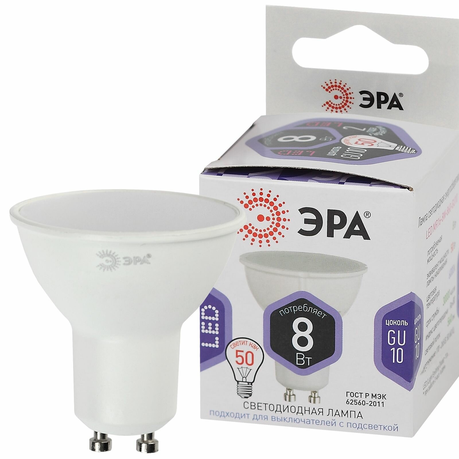Лампа светодиодная LED MR16-8W-840-GU10 8Вт MR16 софит 4000К нейтр. бел. GU10 Эра, ЭРА Б0036729 (1 шт.)