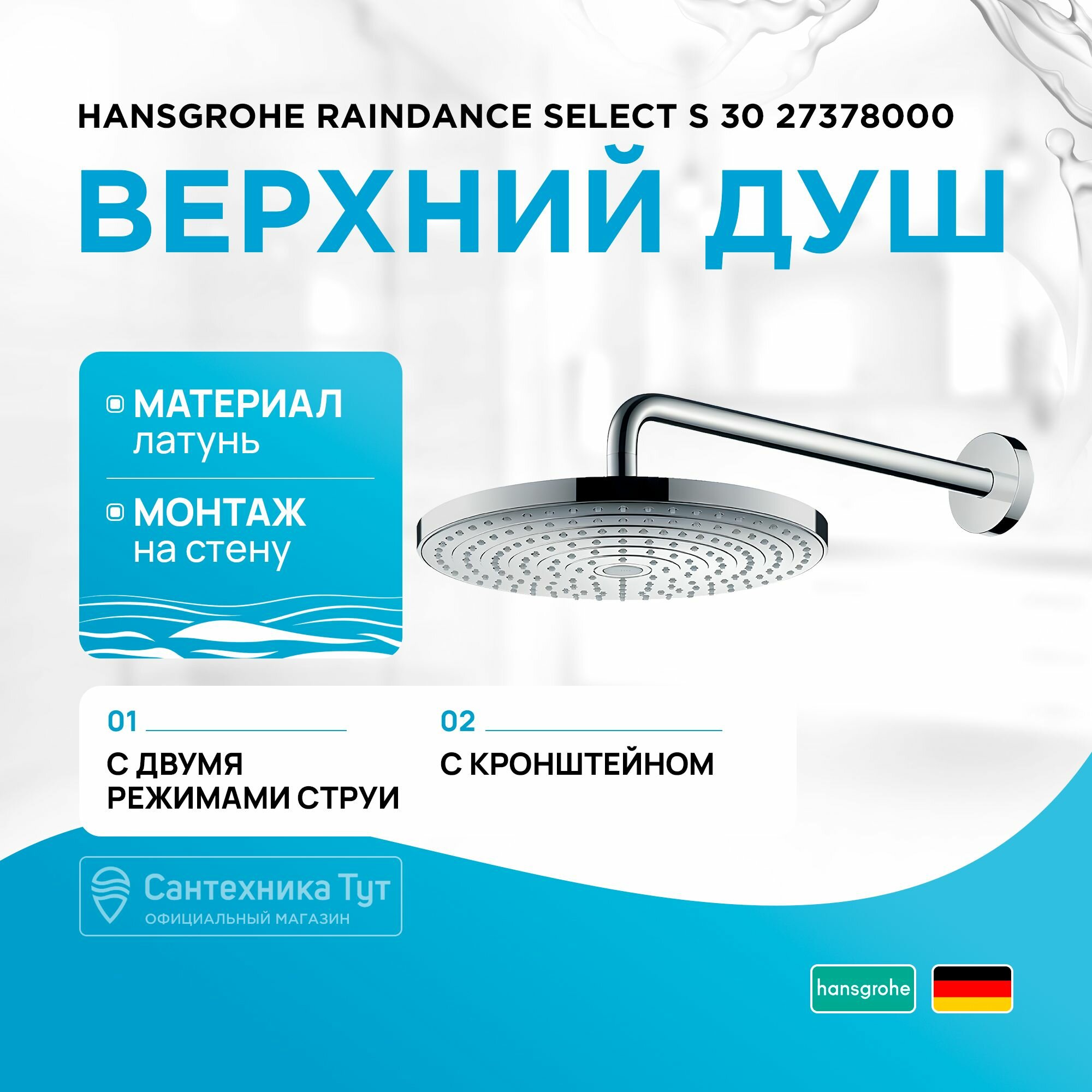 Верхний душ Hansgrohe Raindance Select S 300 2jet 27378000 с держателем 390 мм, ½’