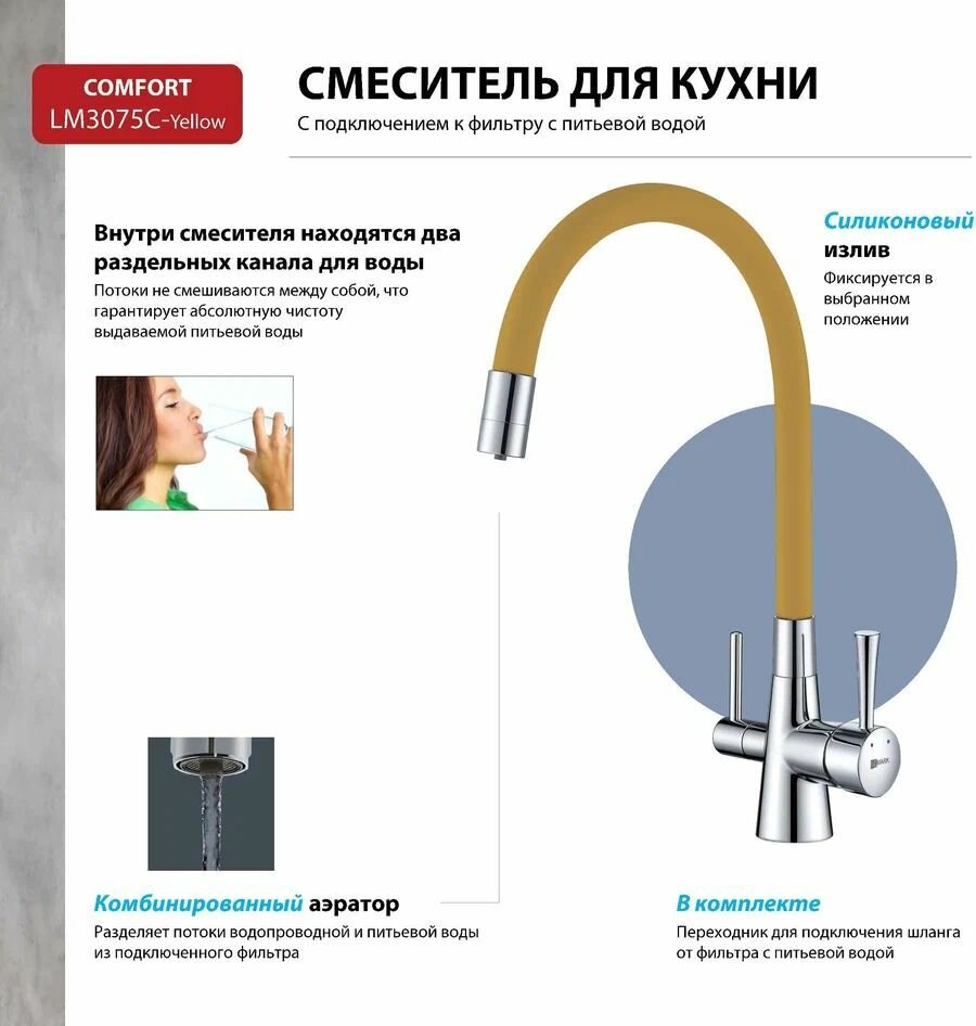 Смеситель Lemark Comfort LM3075C-Yellow для кухни с подключ. к фильтру с питьевой водой, хром/желтый
