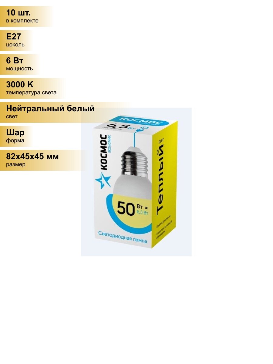 Купить (10 шт.) Светодиодная лампочка Космос шар E27 6,5W (6W) (460lm) 3000K 2K матов. 82x45 LkecLED6.5wGL45E2730 Нейтральный белый. Цоколь E27