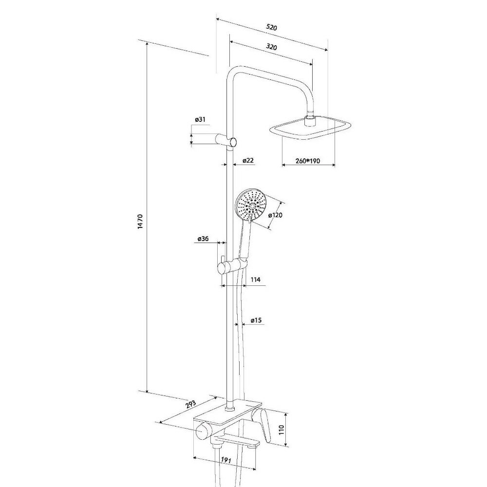 | Дополнительная информация | диаметр ручного душа: 12 см; держатель ручного душа: с регулировкой угла наклона; высота душевой штанги: 147 см; размеры верхнего душа: 26х19 см; механизм смесителя: Damixa Light Flow 35 мм керамический картридж |