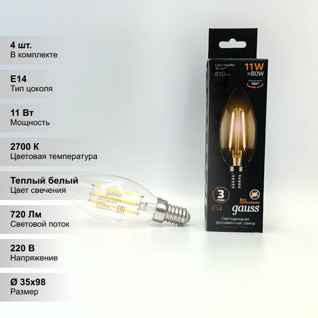 Сохранить(4 шт.) Светодиодная лампочка Gauss С35 свеча, мощность 11 Вт, напряжение питания 150-265 В, цветовая температура 2700 К, теплый белый свет, цоколь E14, размер 35х98 мм, филамент, 103801111 интересное: