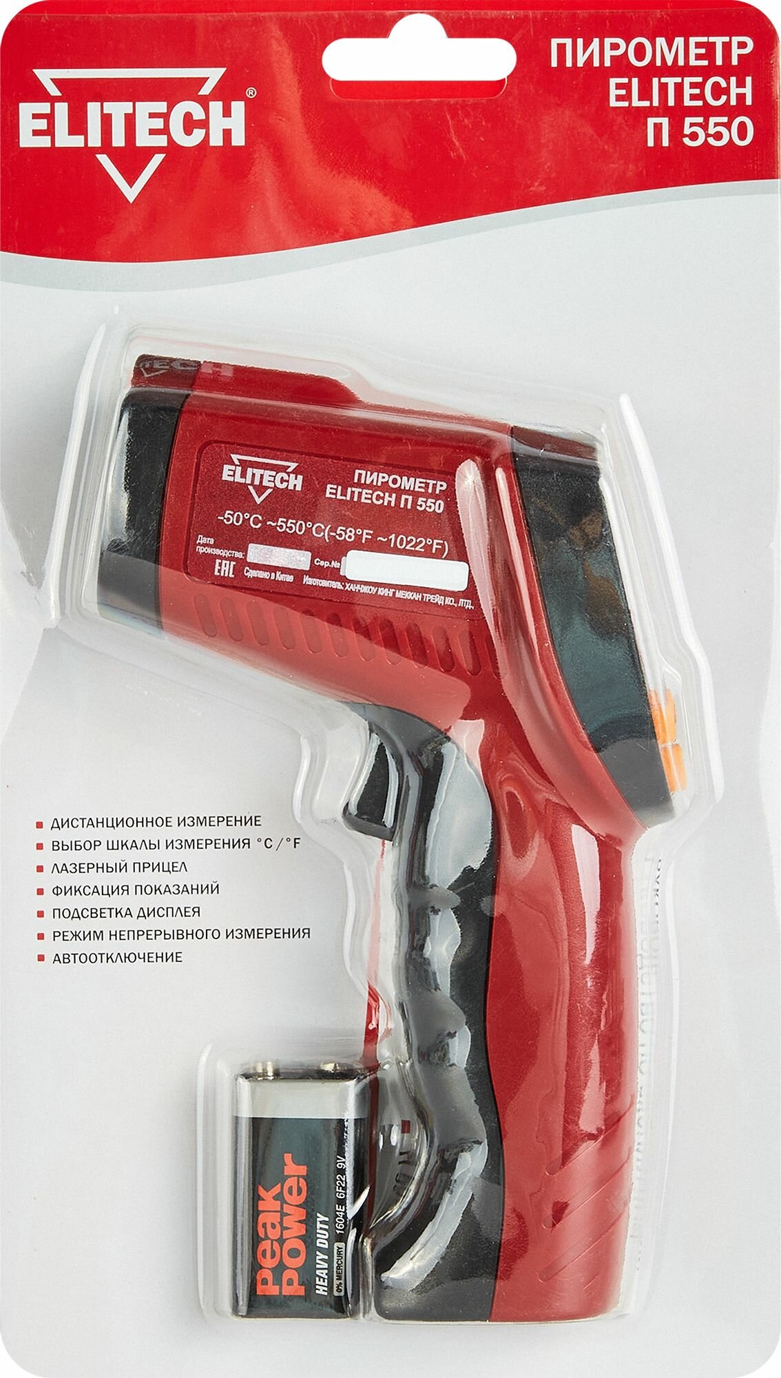 Пирометр ELITECH П 550 Пирометр,от-50°до+550град,9В батарея,лазер,ЖК дисплей,0.15кг,блистер