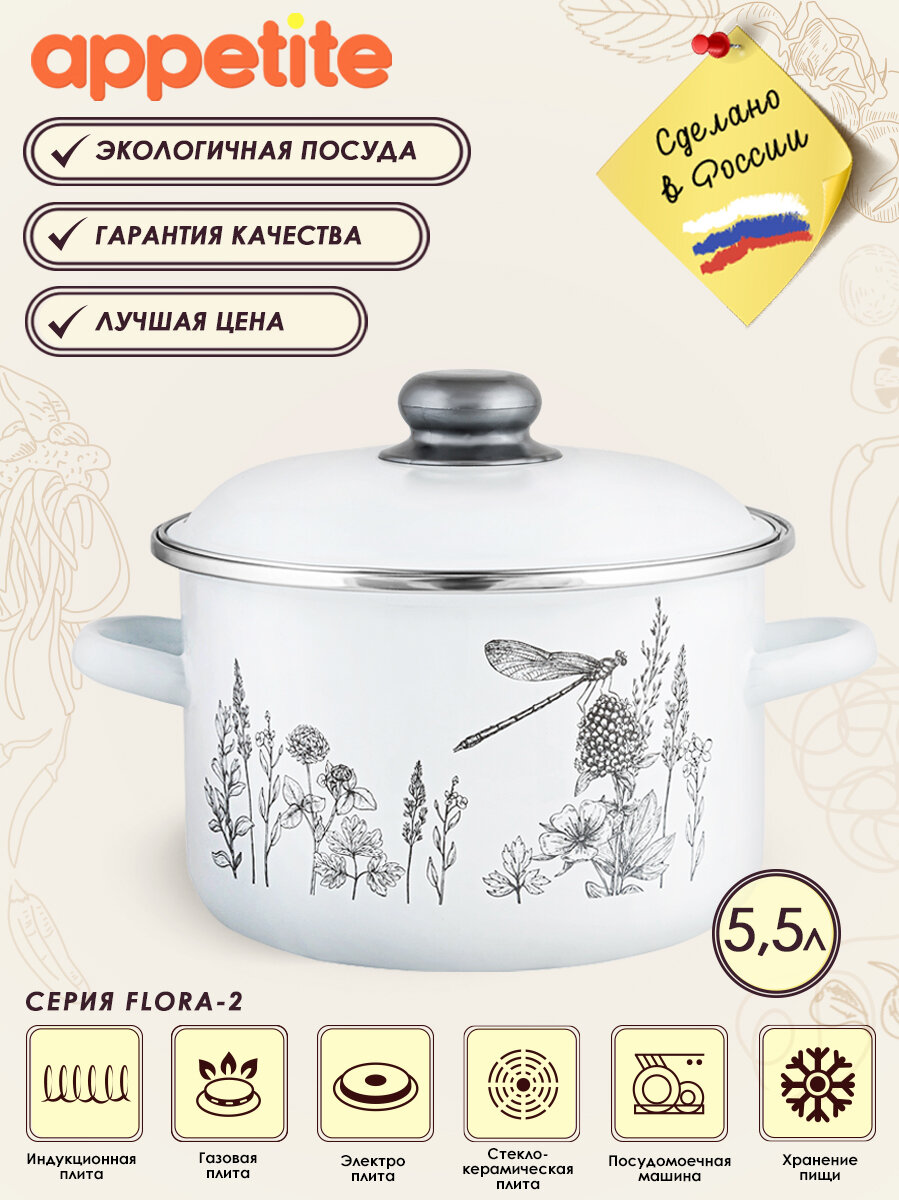 Кастрюля Appetite FLORA-2 5,5л эмаль, крышка эмаль, индукция