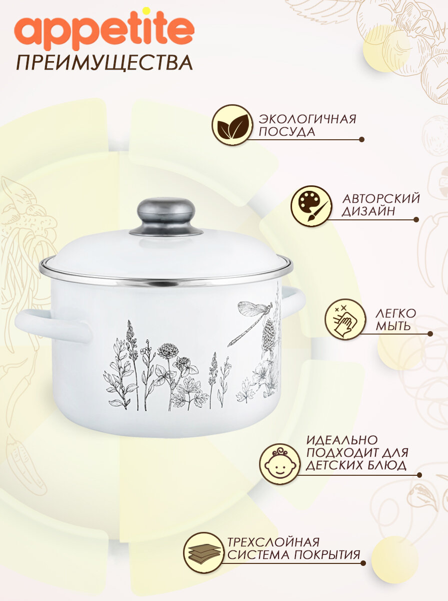 Кастрюля эмалированная Appetite FLORA-2, с крышкой, 4 л