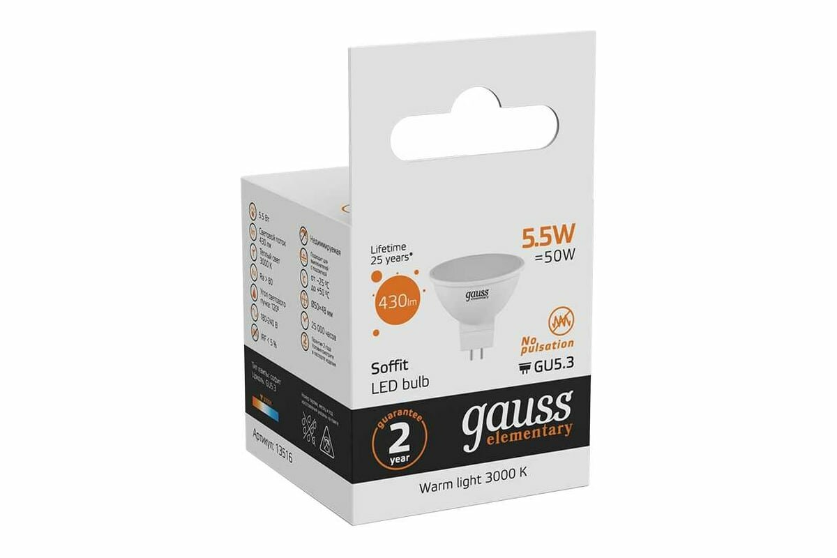 Лампа светодиодная GU5.3 Gauss Софит, 5,5Вт, 3000К, лампочка 1 шт. 13516