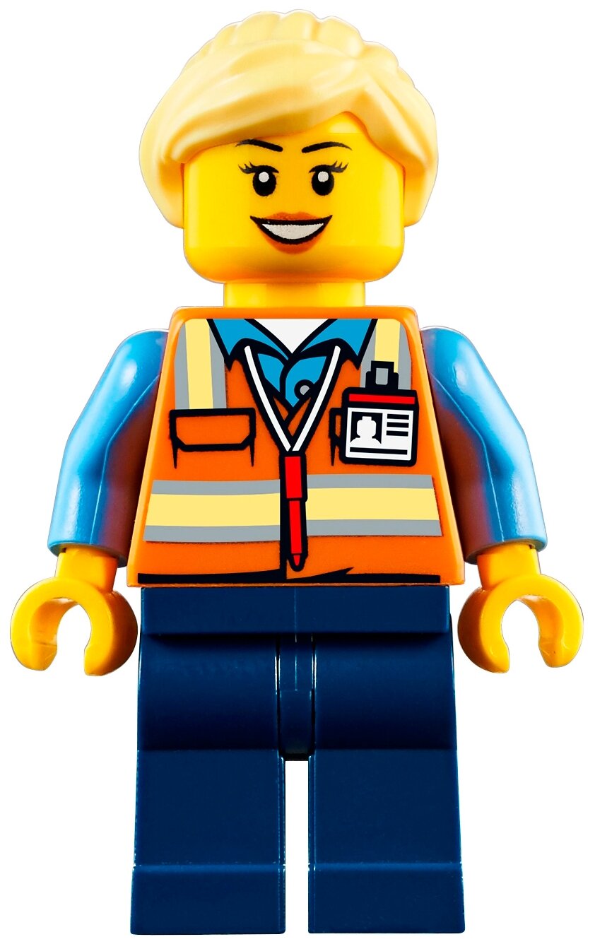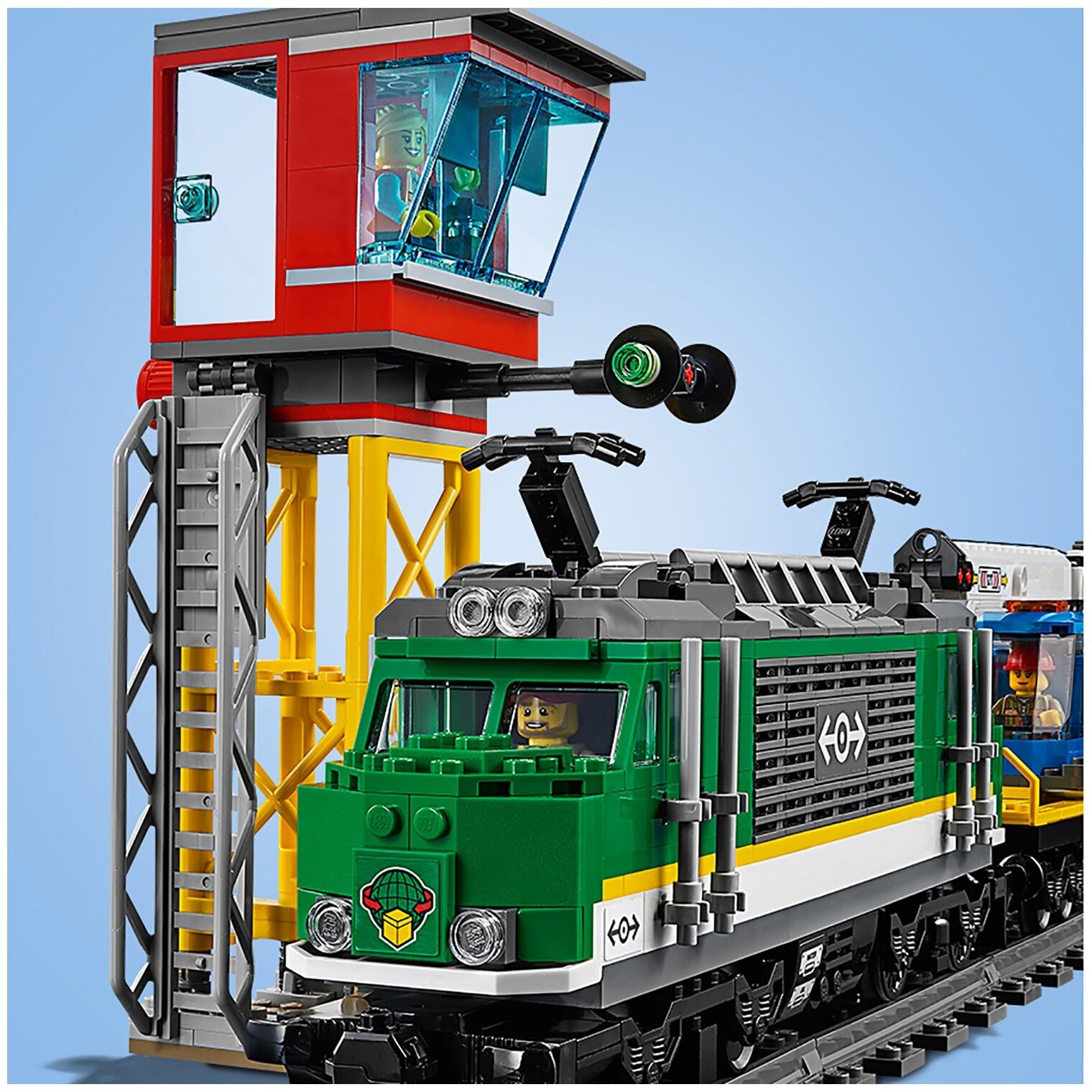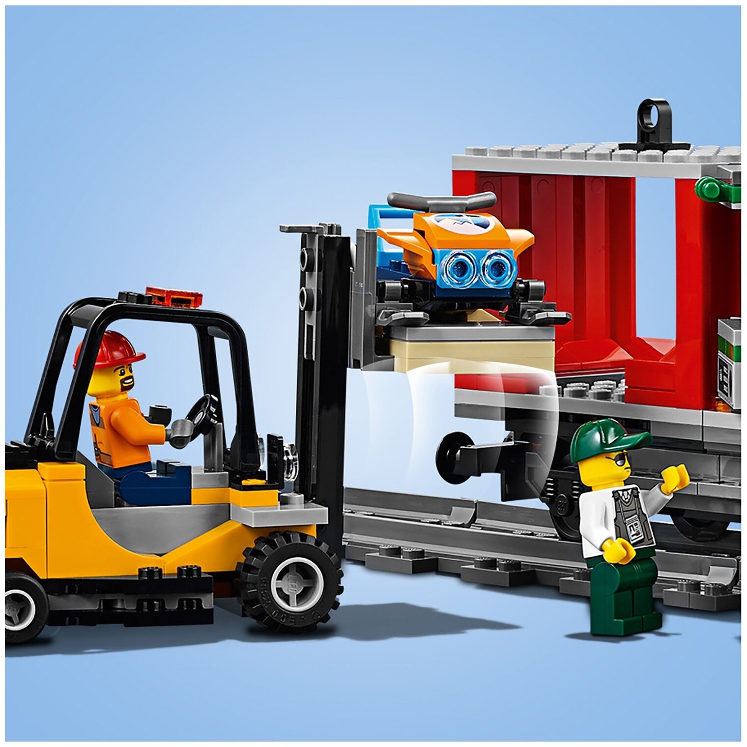 | Комплектация | 6 фигурок, 3 вагона, локомотив, погрузчик, инкассаторская машина, диспетчерская вышка, рельсы с переездом и тупиком, пульт ДУ, аксессуары, 1226 деталей, инструкция |