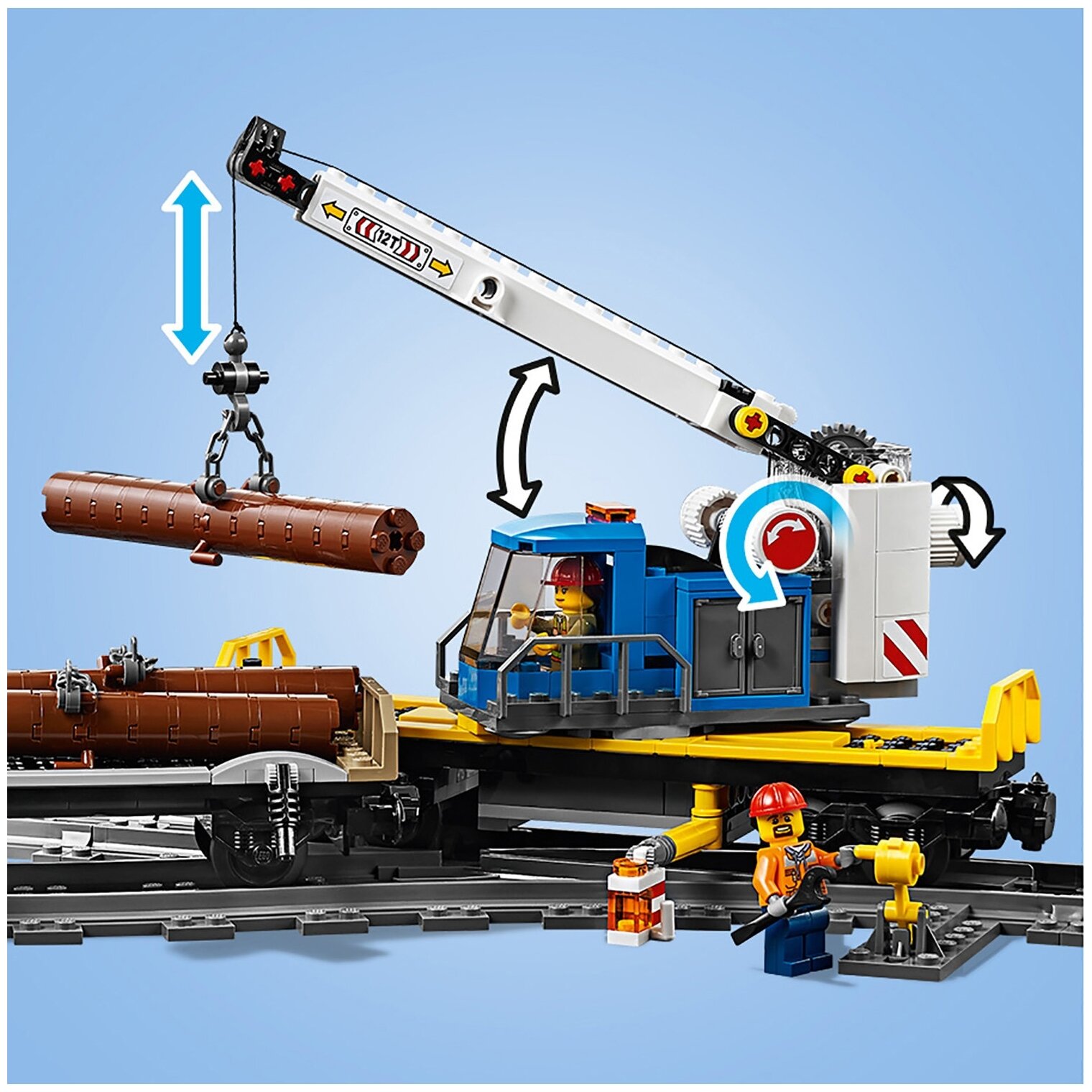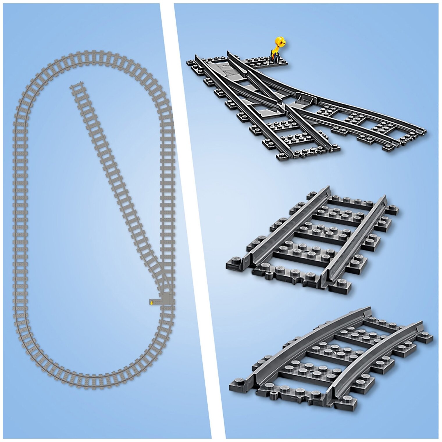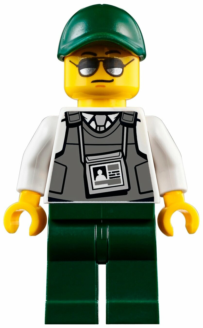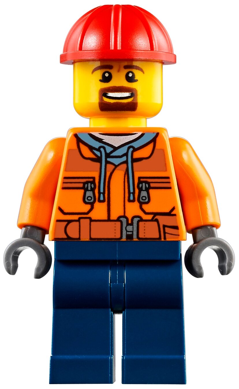 | Комплектация | 6 фигурок, 3 вагона, локомотив, погрузчик, инкассаторская машина, диспетчерская вышка, рельсы с переездом и тупиком, пульт ДУ, аксессуары, 1226 деталей, инструкция |
