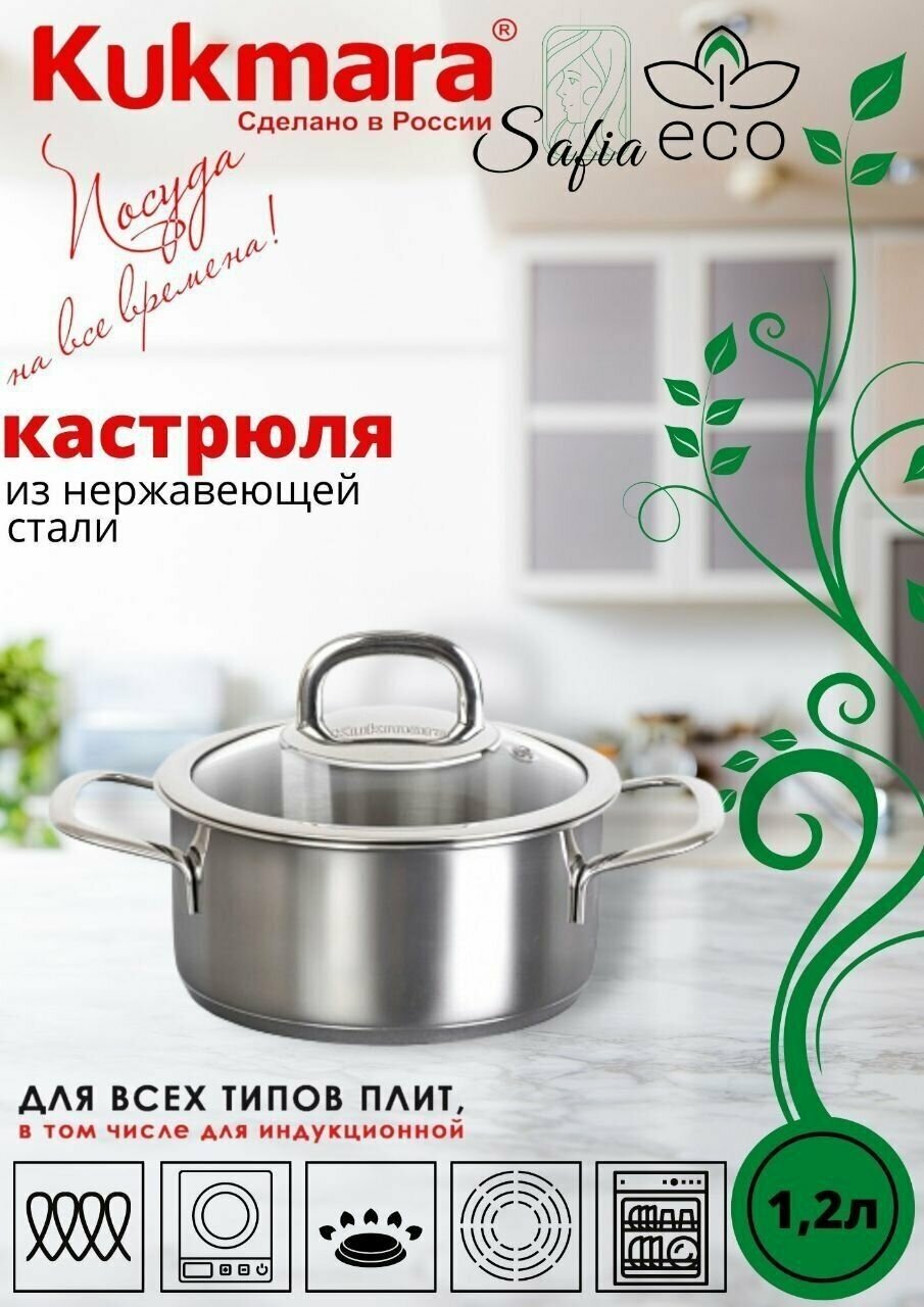 Кастрюля из нержавеющей стали 1,5л со стеклянной крышкой, линия "Safia" Kukmara
