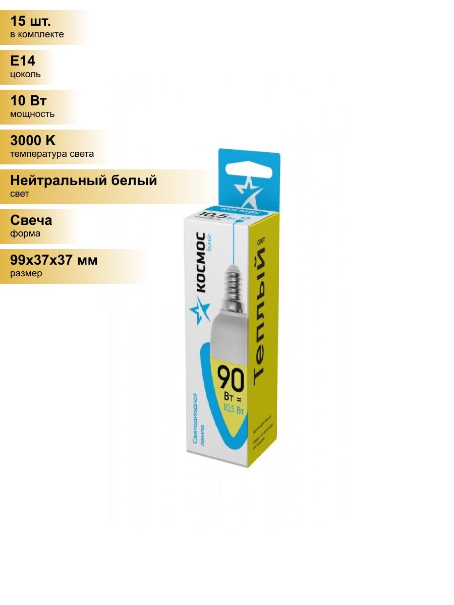 Сохранить(15 шт.) Светодиодная лампочка Космос свеча E14 10,5W (10W) (840lm) 3000K 2K матов. 99x37 LkecLED10.5wCNE1430 Нейтральный белый. Цоколь E14 интересное: