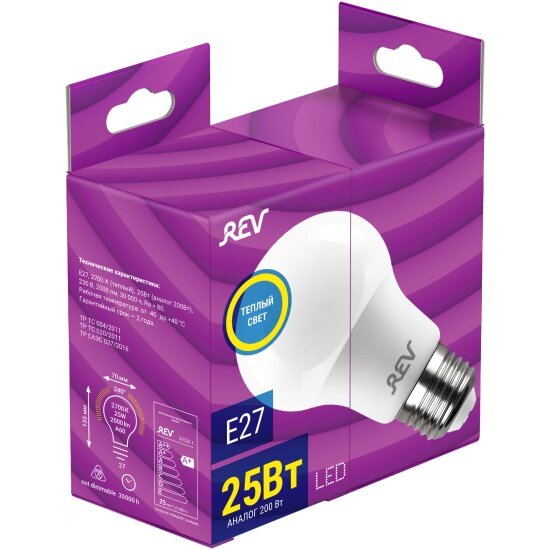 Лампочка светодиодная Rev груша, A60, 25Вт, E27, 2700K, 2000Лм, 32532 1 интересное: