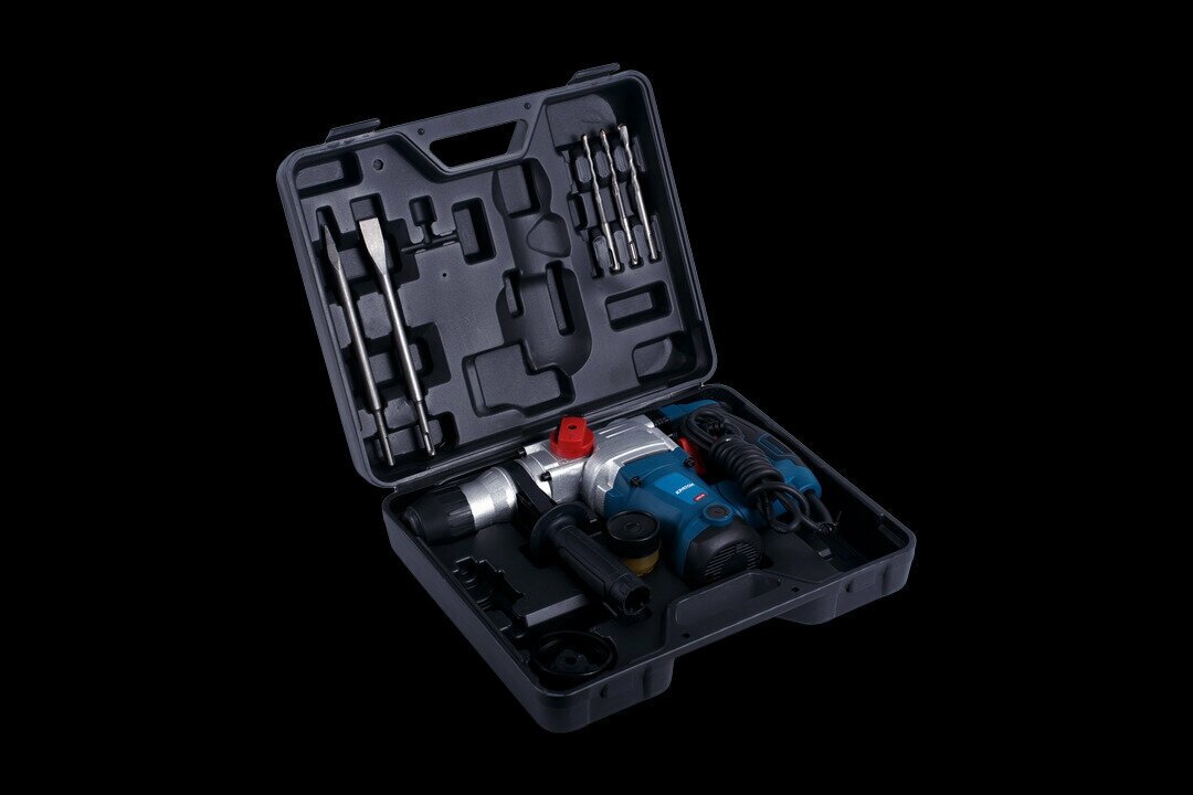 | Комплектация | дополнительная рукоятка, ограничитель глубины сверления, 3 бура, пика, зубило, запасные щетки, пыльник, кейс |