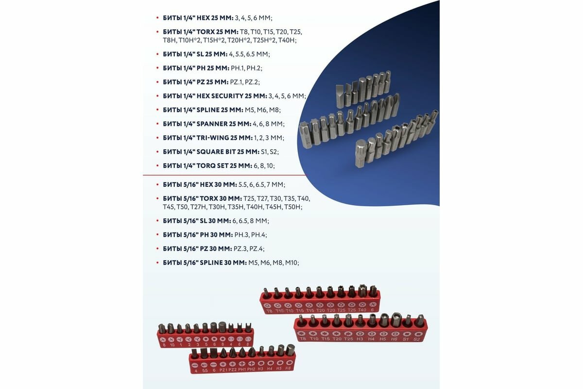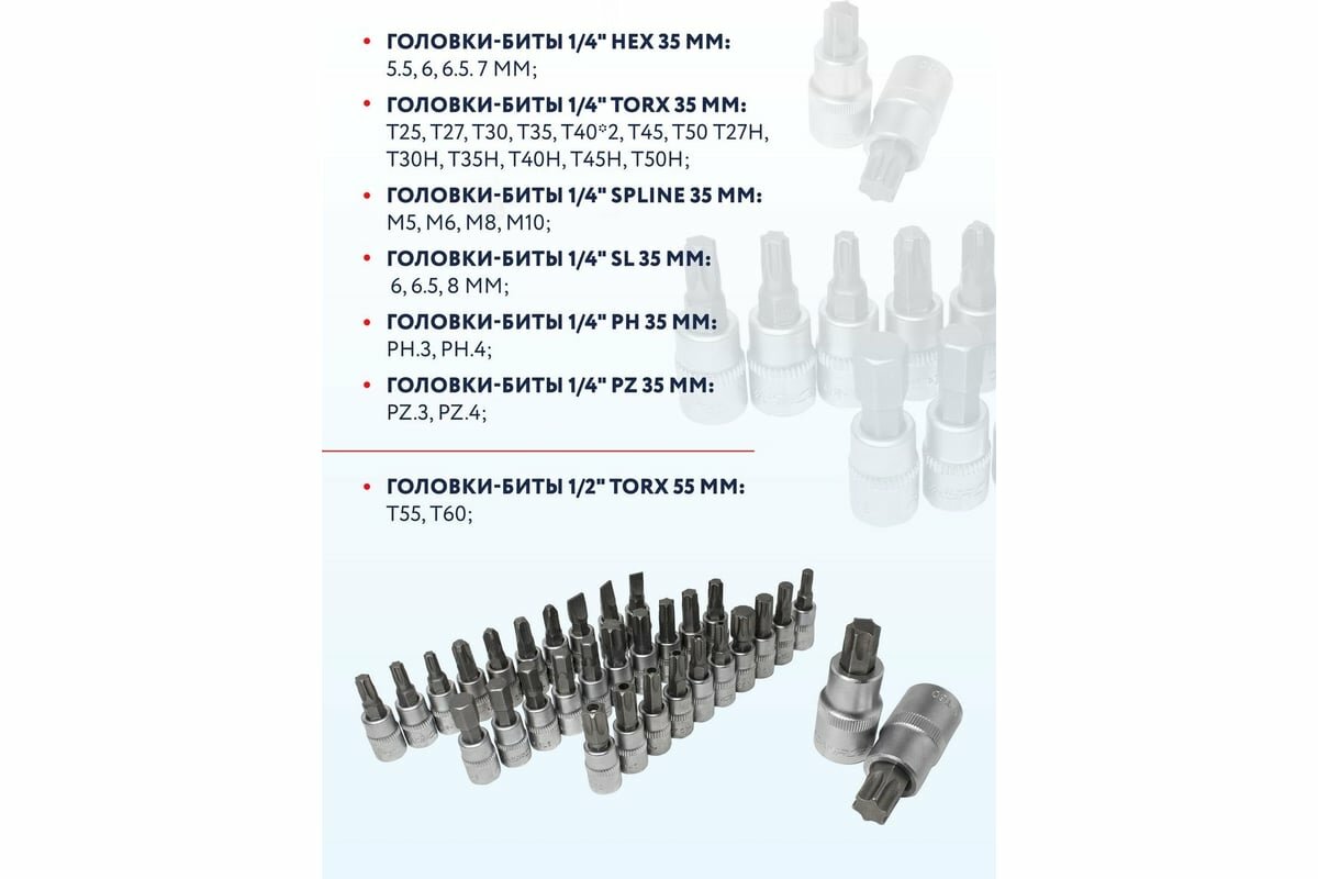 | Головки торцевые подробно | 1/2": 10, 11, 12, 13, 14, 15, 17, 19, 20, 21, 22, 24, 27, 30, 32 мм; 1/2": E20, E22, E24; Т-образный вороток: 1/2", 1/4"; кардан: 1/2", 3/8", 1/4"; трещотка: 1/2", 3/8", 1/4"; 1/2": удлинители 125, 250 мм; 1/2": свечные головки 16, 21 мм; 1/4": 4, 4.5, 5, 5.5, 6, 7, 8, 9, 10, 11, 12, 13, 14 мм; 1/4": E4, E5, E6, E7, E8; 1/4": удлинители 50, 100 мм; 1/4": отвертка под биты; 3/8": 10, 11, 12, 13, 14, 15, 16, 17, 18, 19 мм; 3/8": E10, E11, E12, E14, E16, E18; 3/8": головки свечные 18 мм |