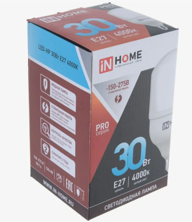 Лампа светодиодная IN HOME LED-HP-PRO, 30 Вт, 230 В, Е27, 4000 К, 2700 Лм