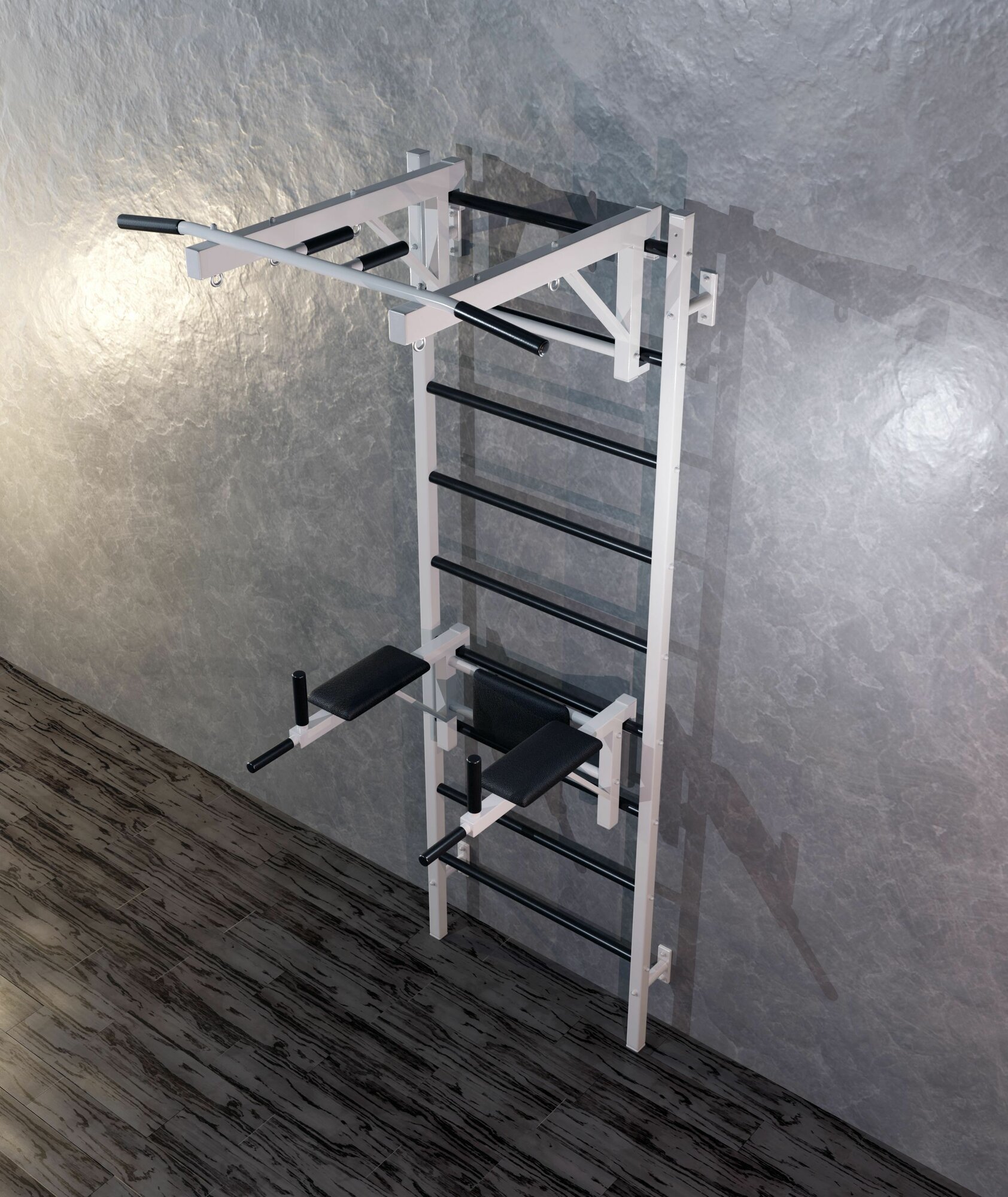 Шведская стенка металлическая + турник с большим выносом + брусья пресс навесные, белые