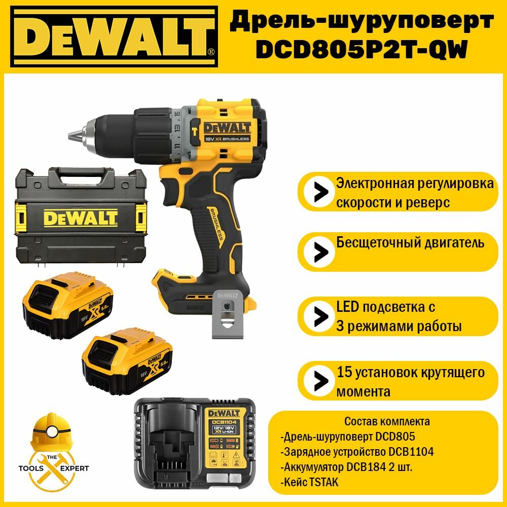 Аккумуляторная ударная бесщеточная дрель-шуруповерт DEWALT DCD805P2T, 18 В, 2 акб 5Ач