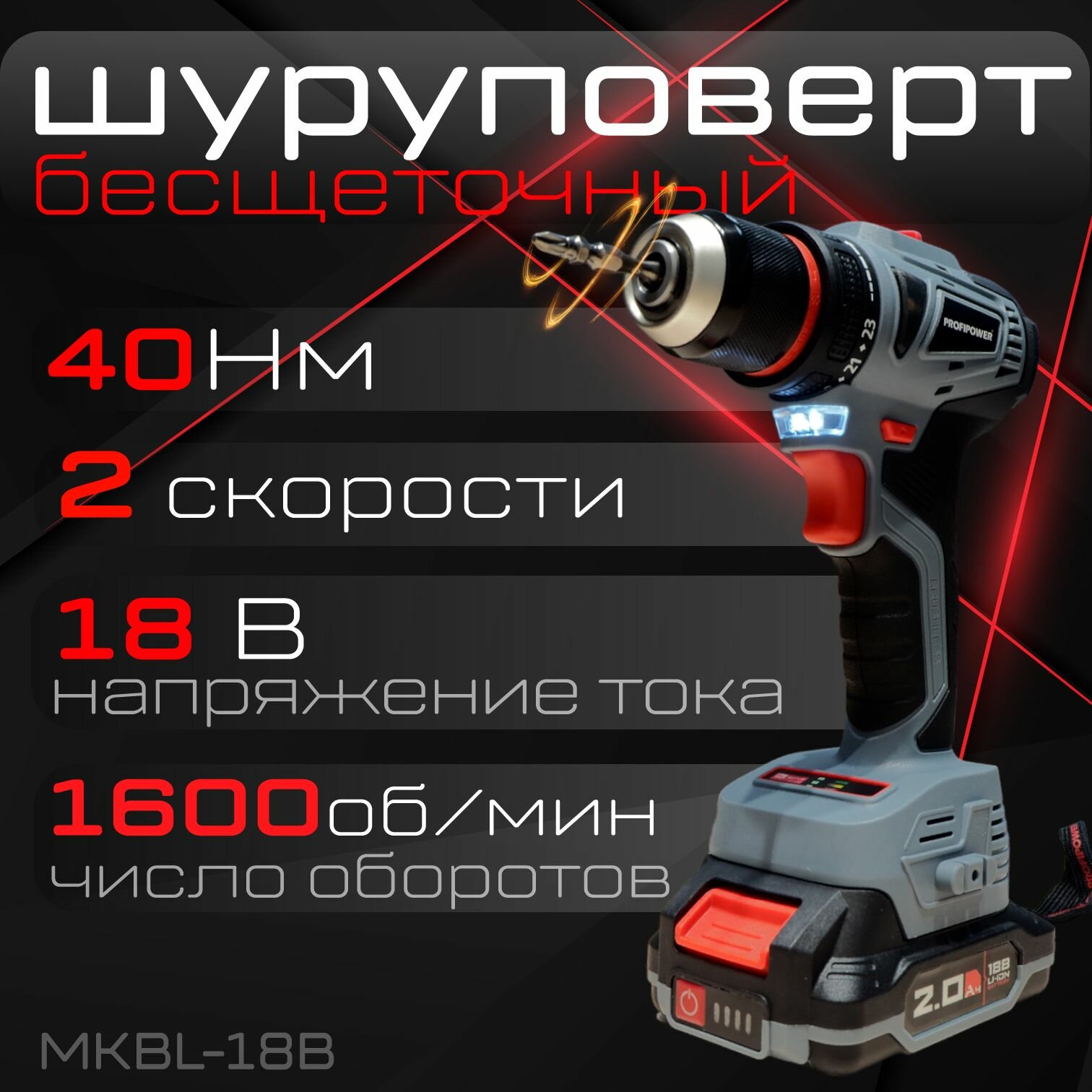 Дрель-шуруповерт Profipower MKBL18В, От аккумулятора, 18 В, 40 Нм, 2 АКБ