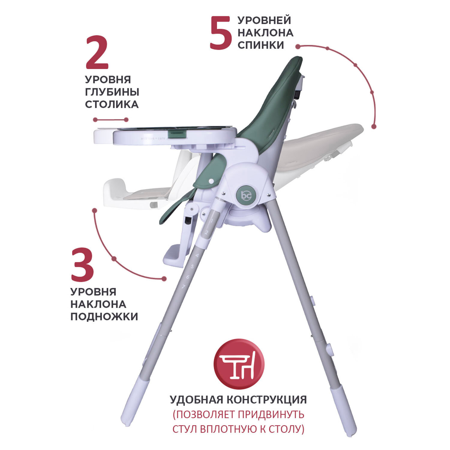 | Регулировка | высоты стульчика / наклона спинки / положения подножки / положения столика |