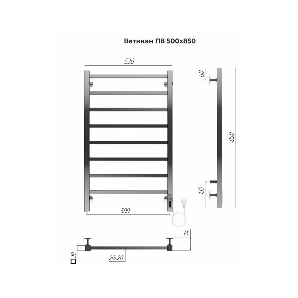 Полотенцесушитель электрический Terminus Ватикан П8 4670078544452 850x530, ТЭН правый, хром