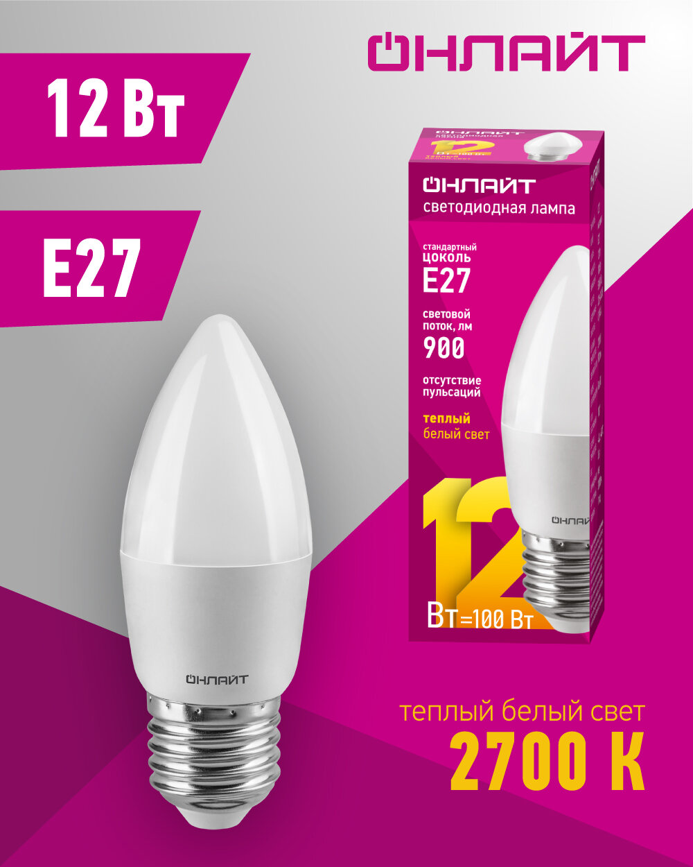 Лампа светодиодная онлайт 90 058, 12 Вт, свеча Е27, дневной свет 4000К, упаковка 10 шт.