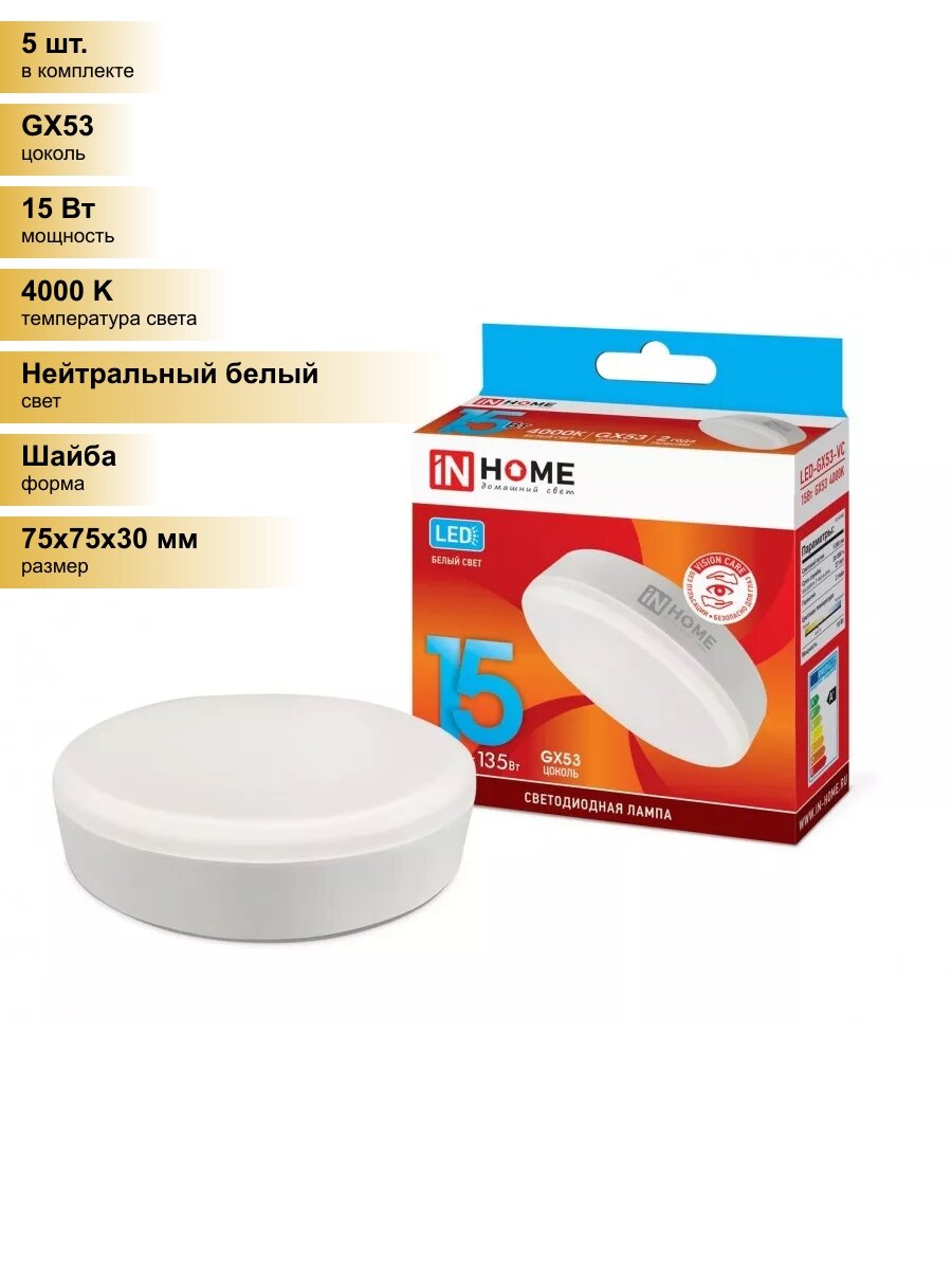 Купить (5 шт.) Светодиодная лампочка ASD/inHome VC GX53 св/д 15W(1350lm) 4000К 4K 75x30 (без пульсации) 0822 Нейтральный белый. Цоколь GX53