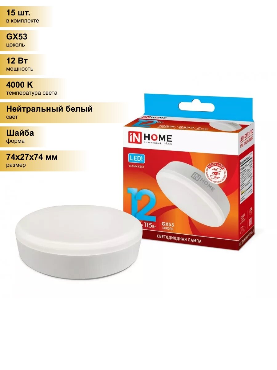 Сохранить(15 шт.) Светодиодная лампочка ASD/inHome VC GX53 св/д 12W(1080lm) 4000К 4K 74x27 (без пульсации) 0792 Нейтральный белый. Цоколь GX53 интересное: