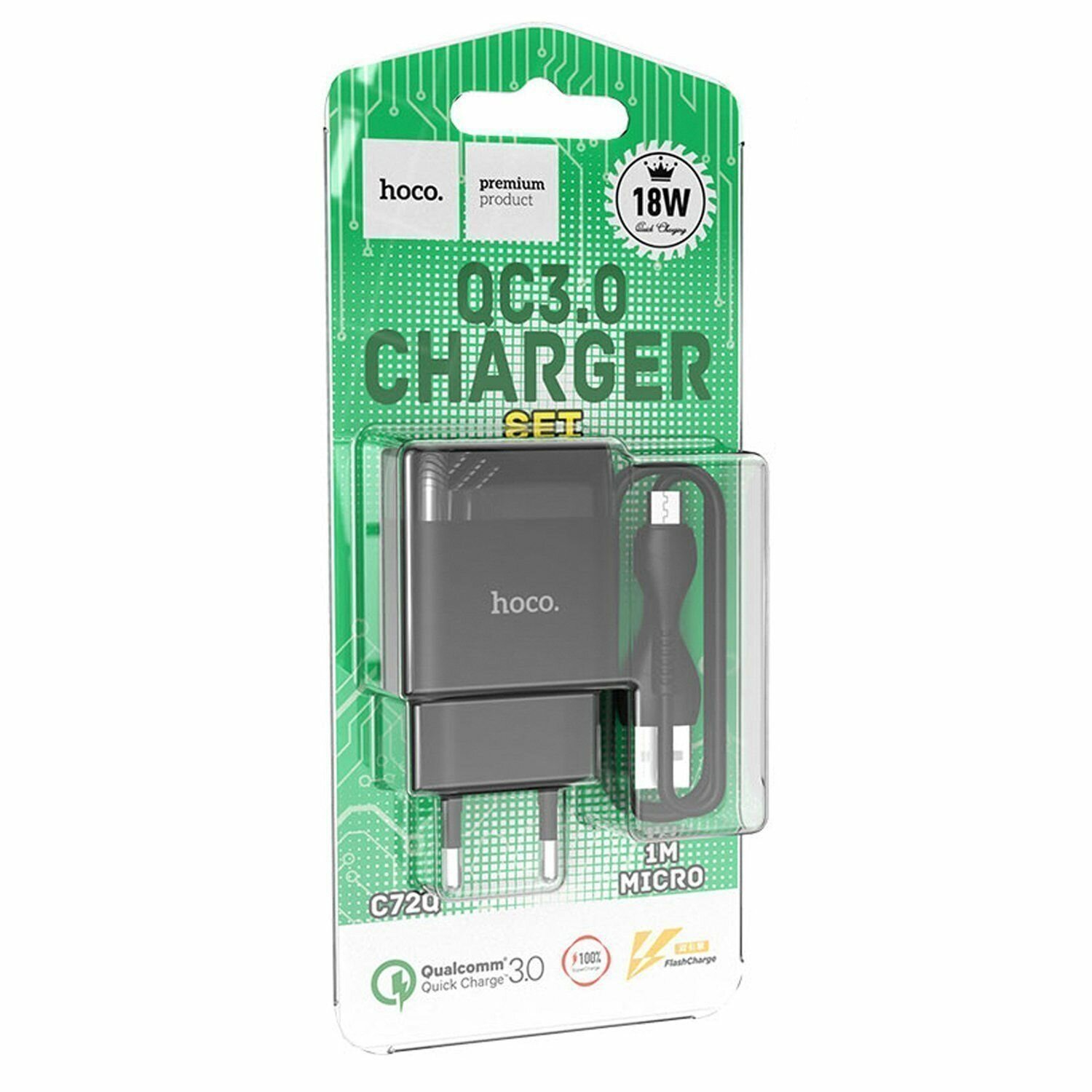 Сетевое зар. устр. Hoco C72Q с шнуром Micro 1USB QC3.0 18W черное