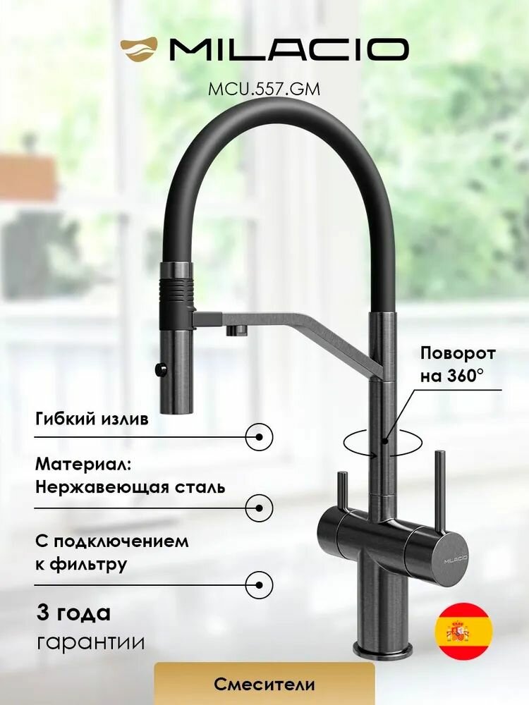 Купить Смеситель для кухни с гибким изливом и подключением к фильтру Milacio Ultra MCU.557. GM вороненая сталь