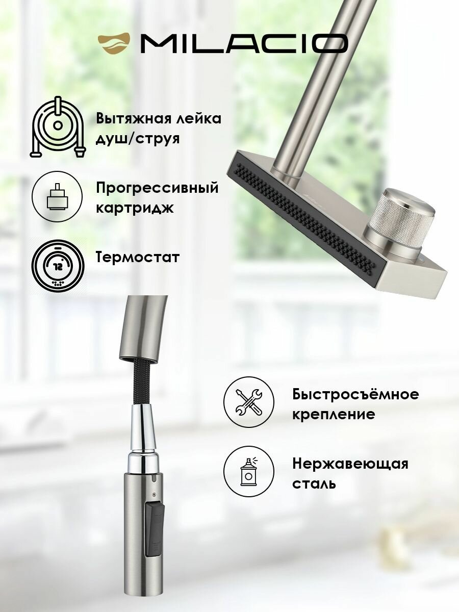Смеситель для кухни с вытяжной лейкой и каскадным душем Milacio Ultra MCU.556.SS сталь нержавеющая