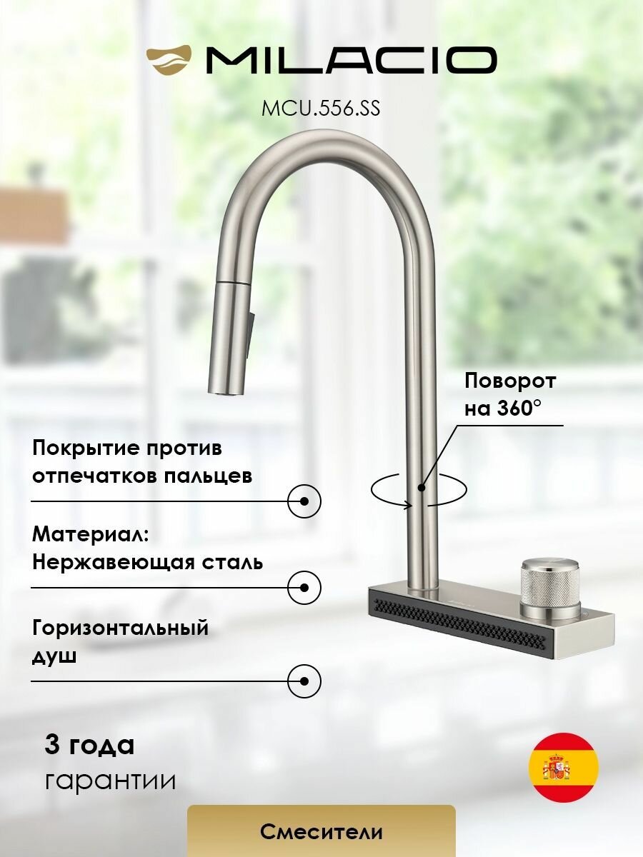 СохранитьСмеситель для кухни с вытяжной лейкой и каскадным душем Milacio Ultra MCU.556. SS сталь нержавеющая интересное: