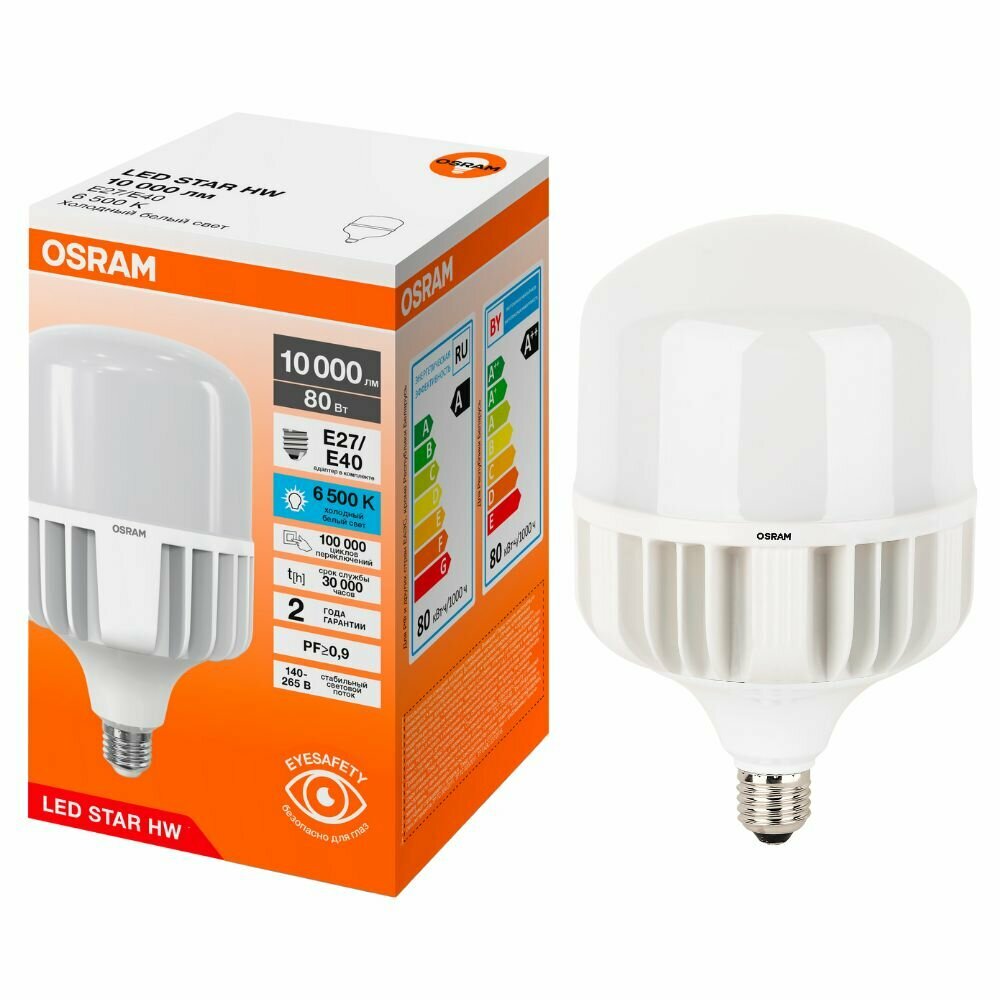 Купить Мощная лампа 80Вт OSRAM LED STAR HW, Е27 (+ цоколь Е40), 6500К холодный белый свет, 10000лм, колба Т матовая алюминий