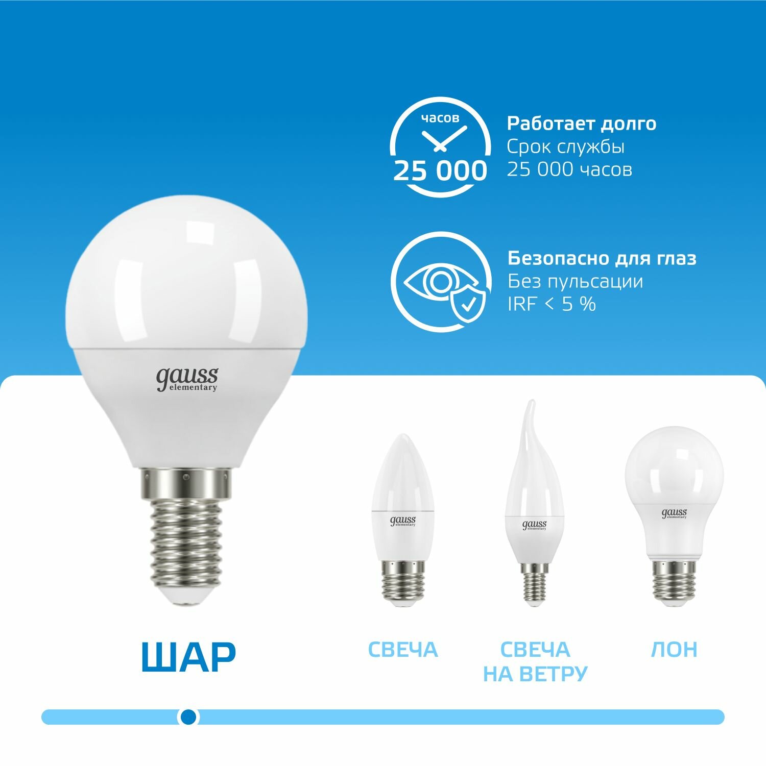 20шт. Gauss Лампа Elementary Шар 6W 450lm 4100K Е14 LED, 53126