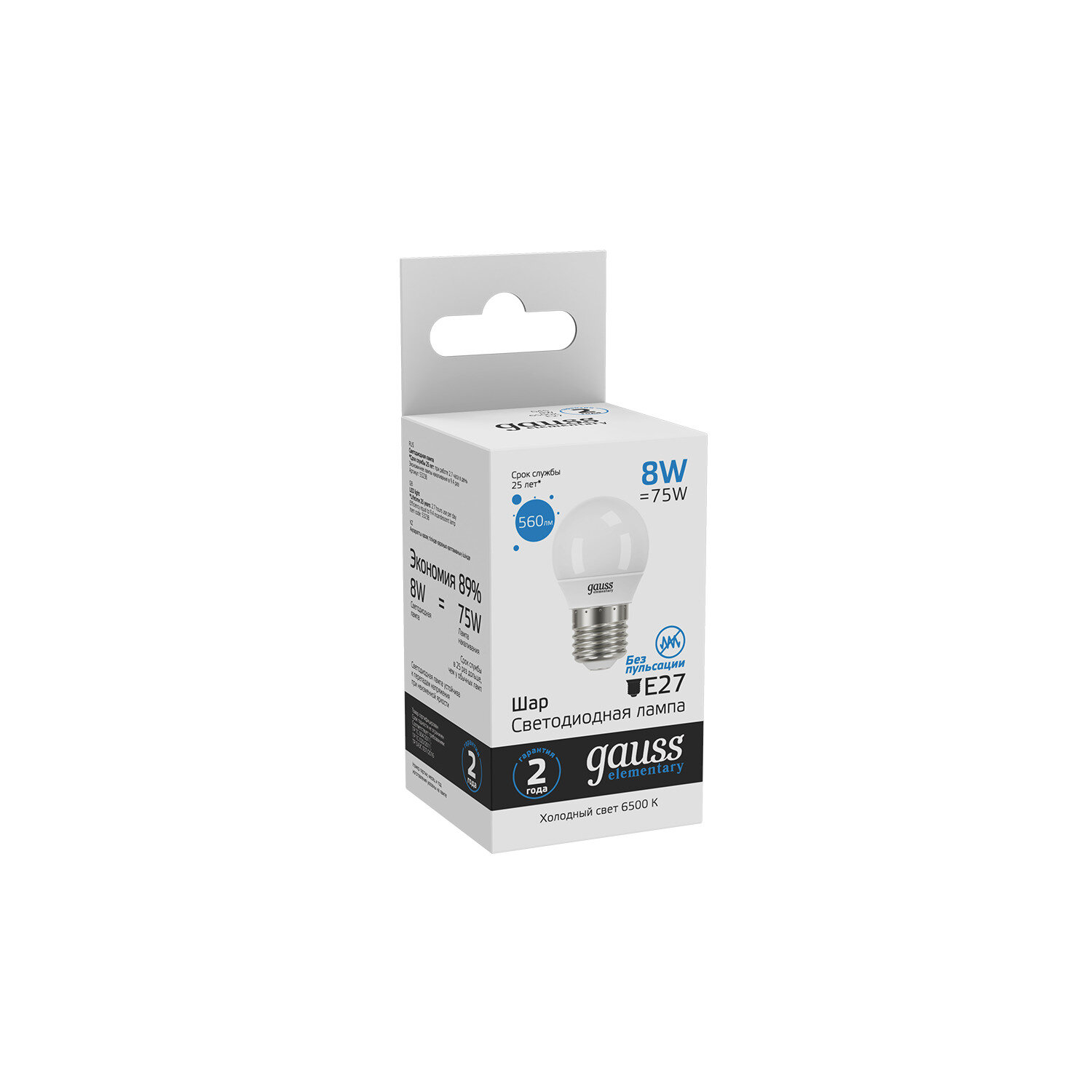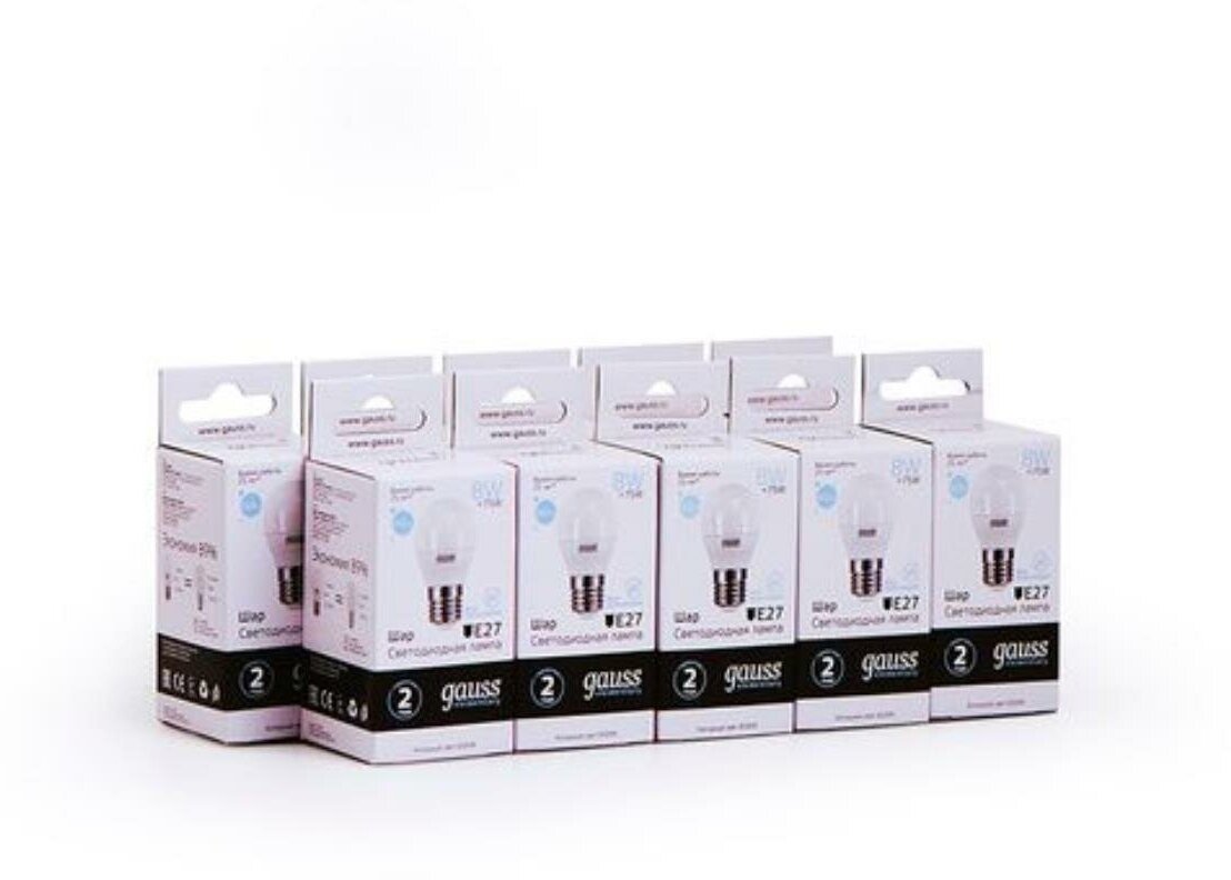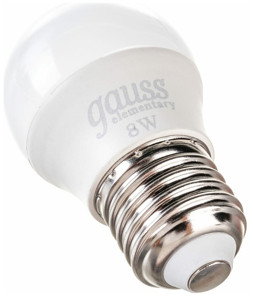 Лампочка светодиодная Е27 Шар 8W холодный свет 6500K упаковка 10 шт. Gauss Elementary