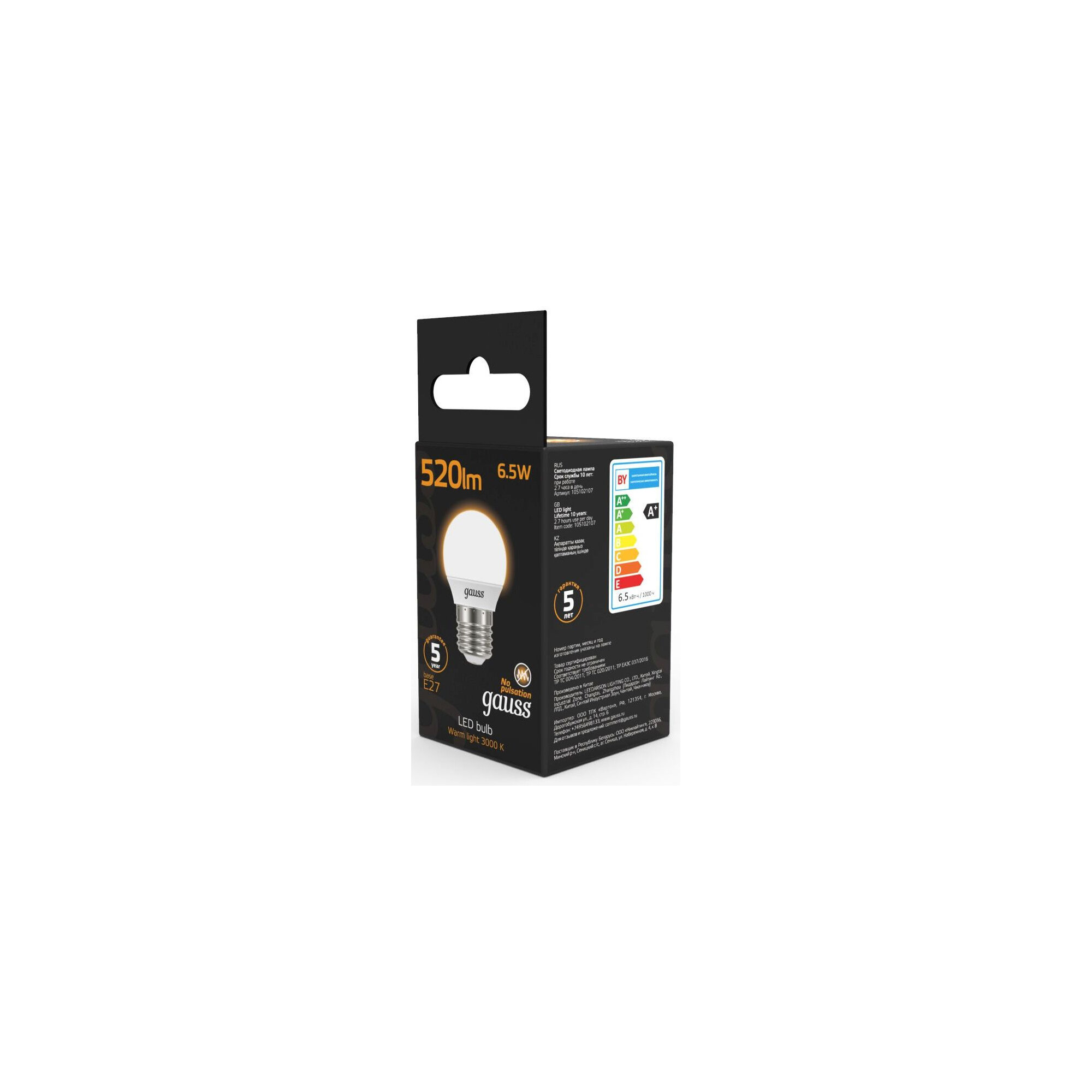 10шт. - Лампа светодиодная LED 6.5 Вт 520 лм 3000К AC150-265В E27 шар P45 теплая Black Gauss / GAUSS; арт. 105102107; оригинал / - комплект 10шт